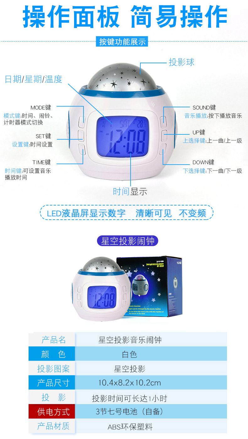 1038 Music Starry Sky Projection Clock, Creative Natural Sound Alarm Clock, Colorful Atmosphere Projection Clock, Lazy Person's Snooze Electronic Clock