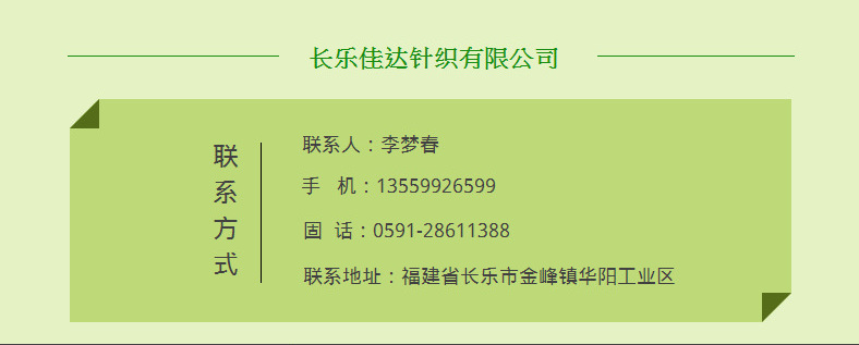 Changle Jiada Knitting Co., Ltd. is located in Jinfeng Town, Changle City, Fujian Province. It specializes in the production of various specifications of warp and weft knitted fabrics, including Nylon mesh, polyester mesh, D-shaped sand, 20D plain fabric, American mesh, reinforced transparent mesh, Swiss mesh, diamond mesh, hard mesh, coarse mesh, base fabric, nylon ammonia mesh, polyester ammonia mesh, four-corner mesh fabric, B3, starry sky, mosquito net fabric, printed mesh fabric, embroidered mesh fabric, hexagonal mesh fabric, jacquard lace, striped warp knitted mesh fabric, etc.