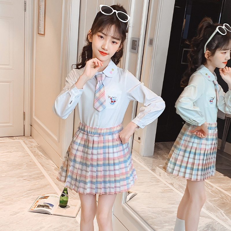 2022 New Children's jk plaid skirt three-piece set, girls' sweater, Spring and Autumn school style, stylish