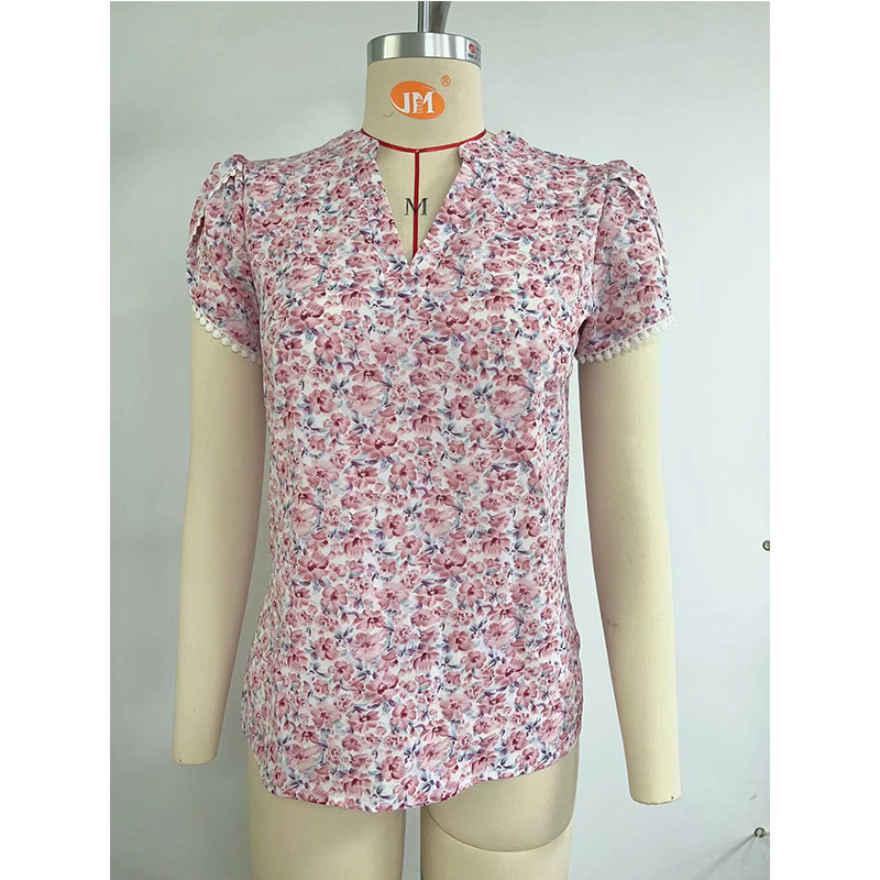 2023 Amazon New Women's cross-border European and American women's V-neck chiffon floral blouse Lace petal sleeve shirt