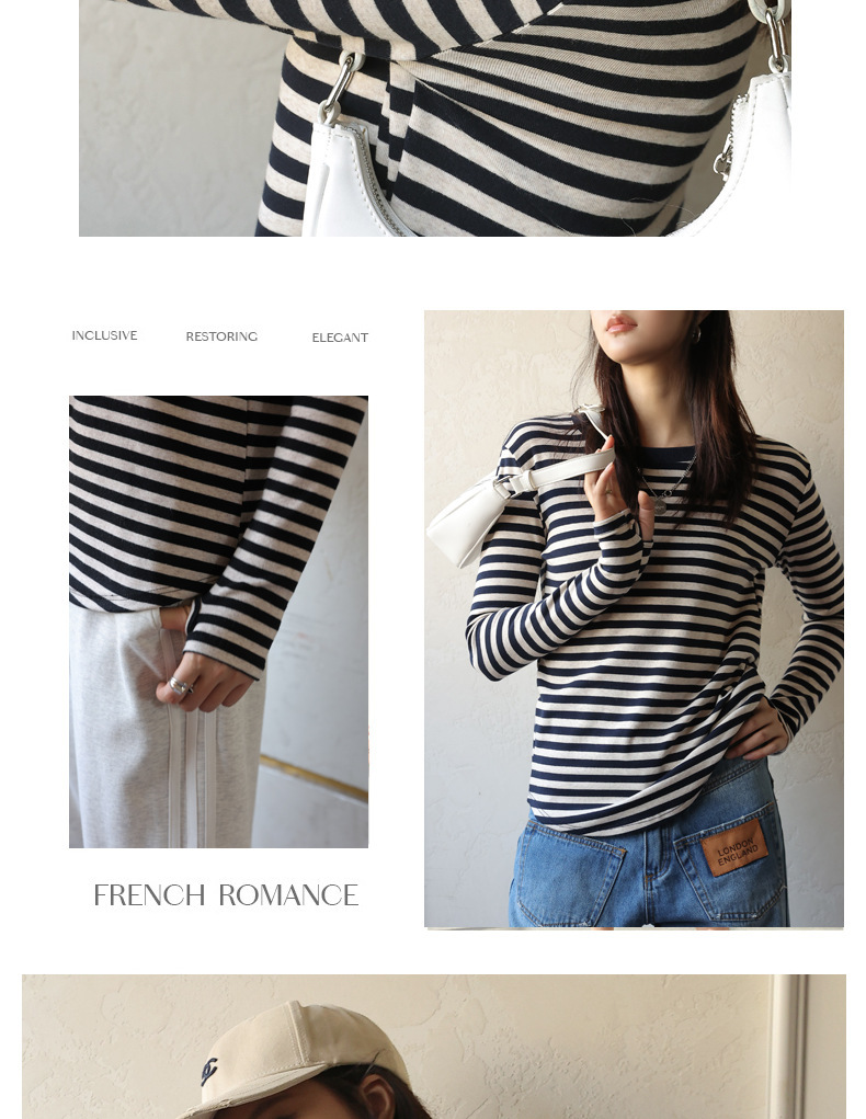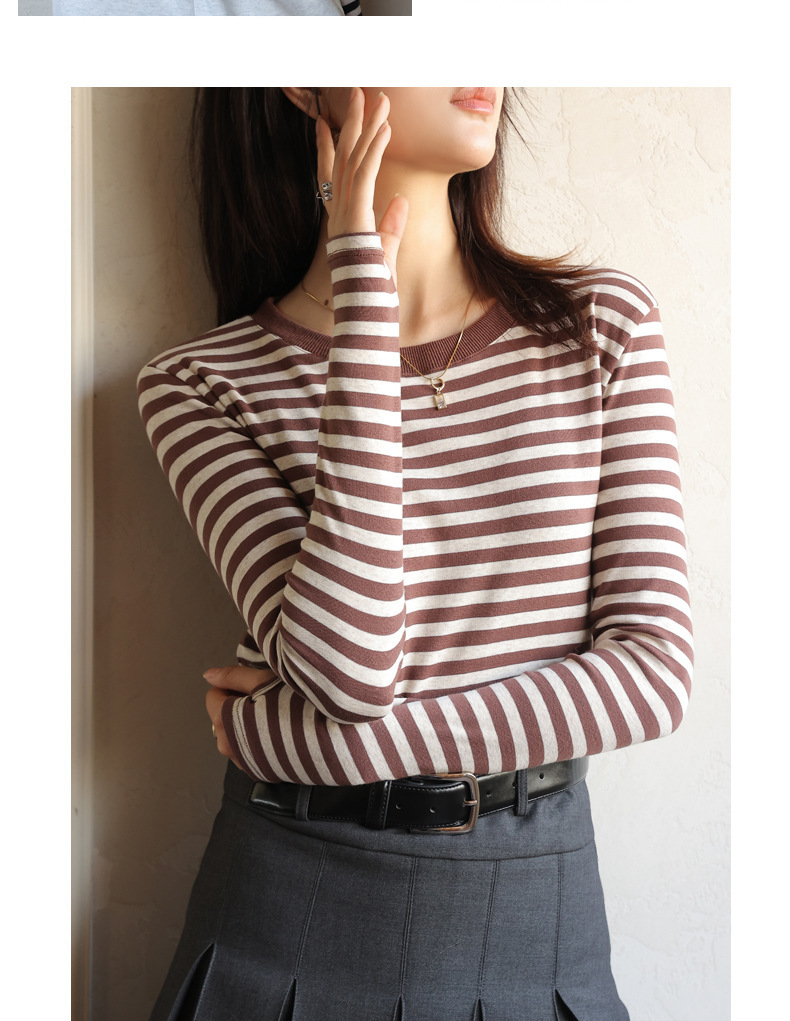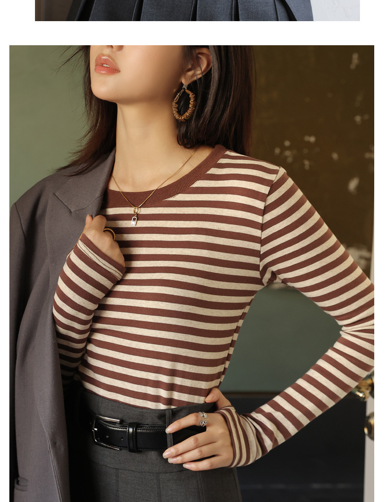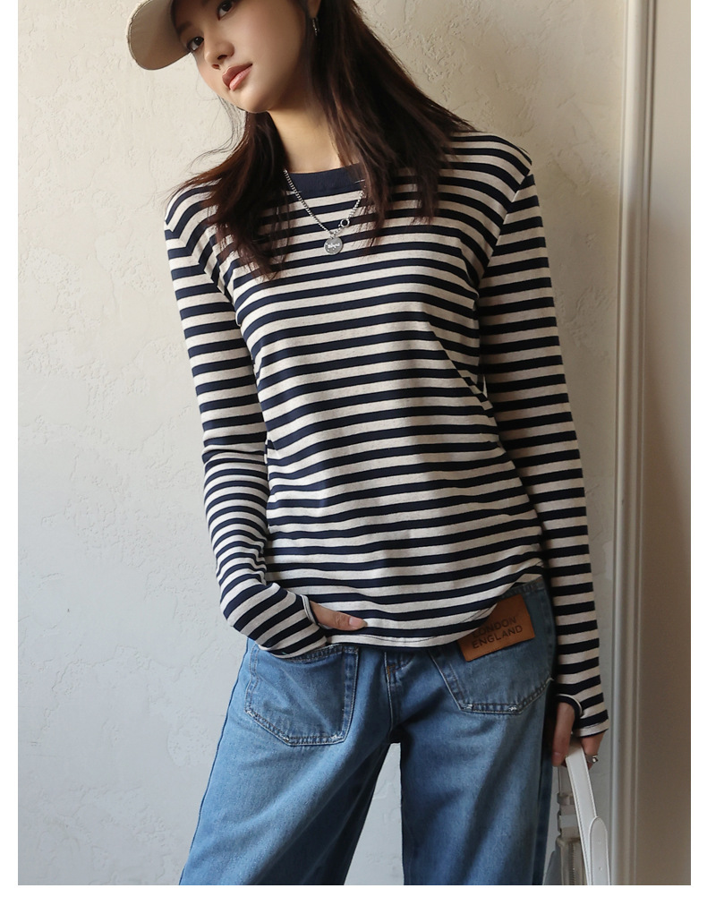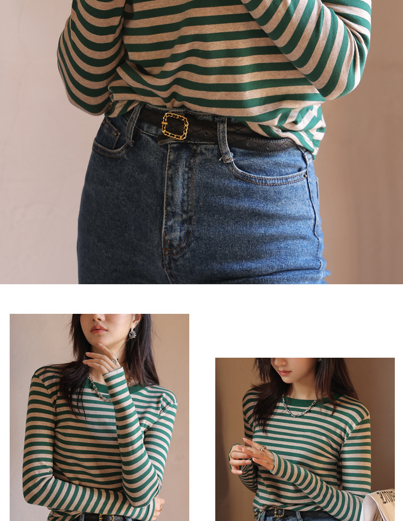 2023 New style green striped T-shirt women's long-sleeved spring and autumn blouse, paired with a base layer for autumn women's wear