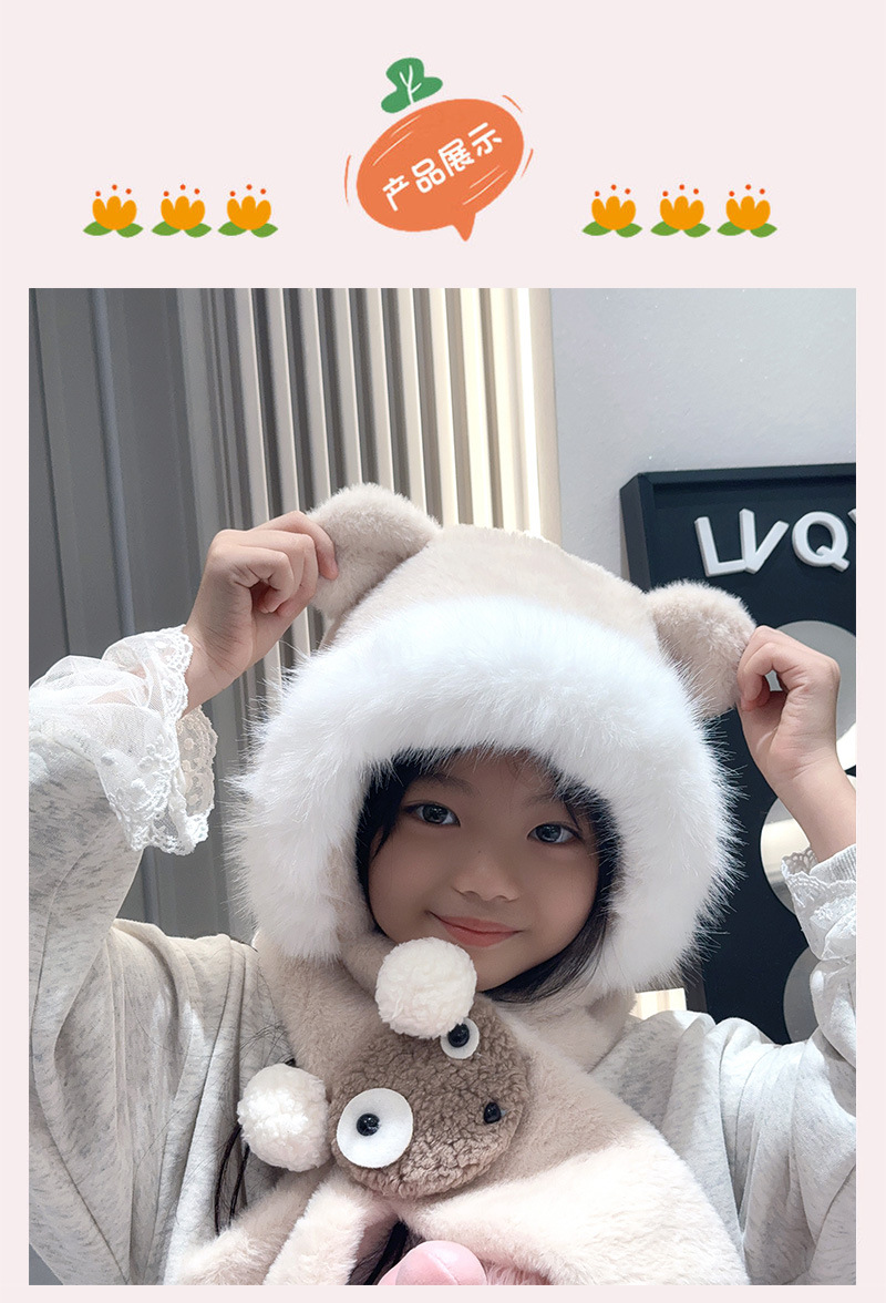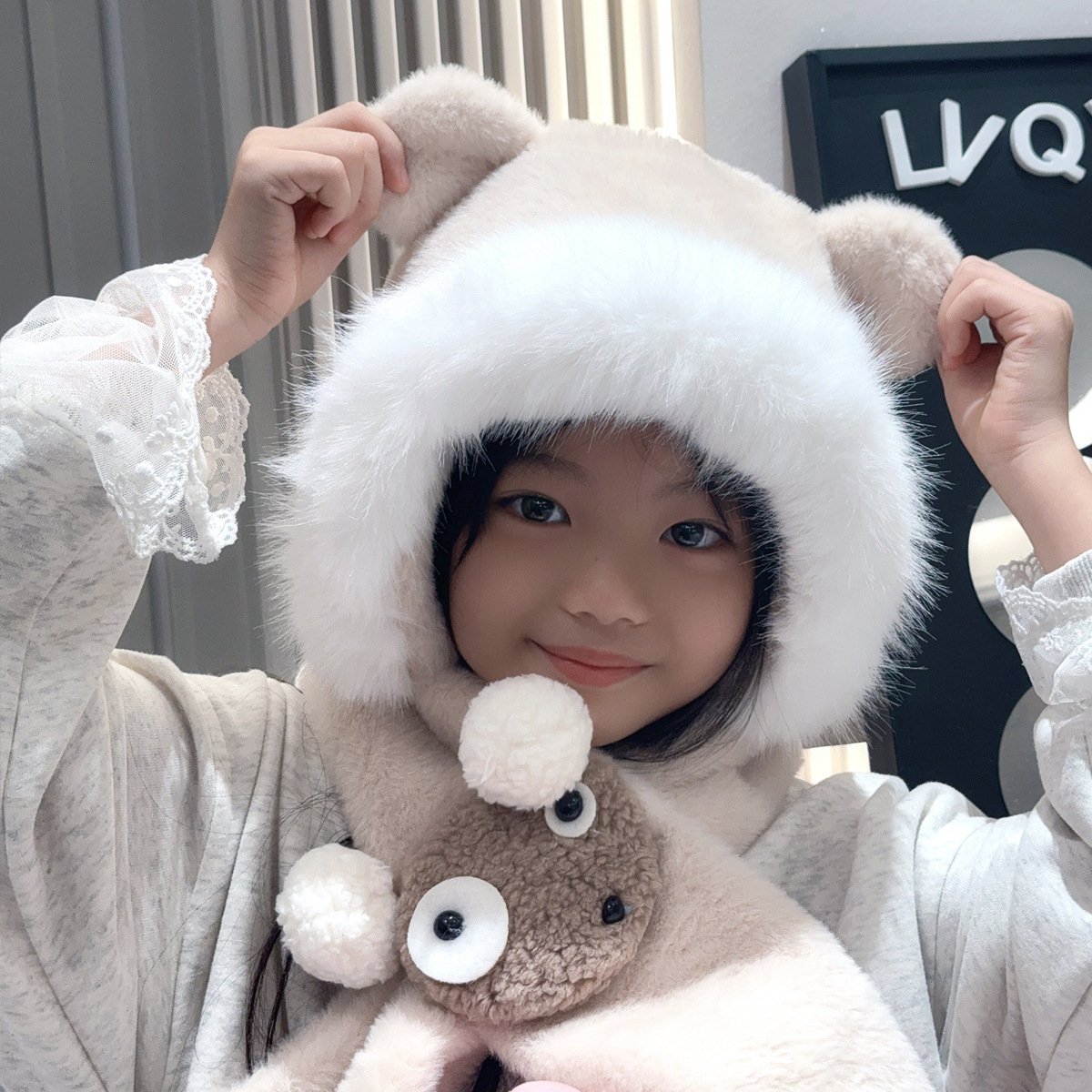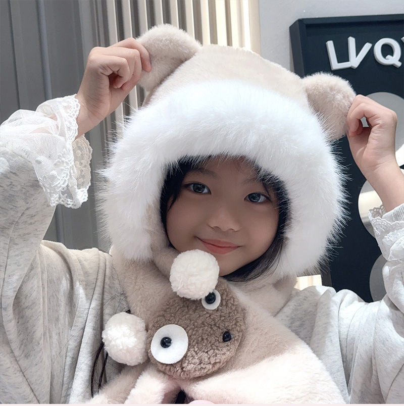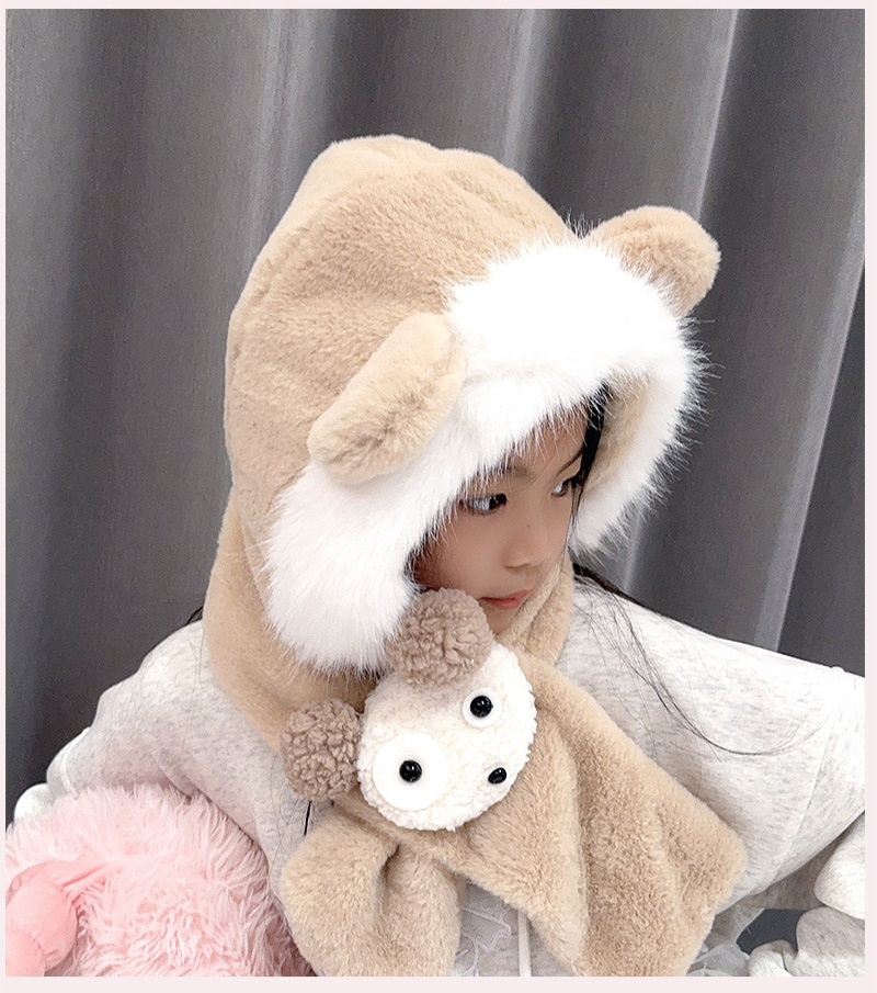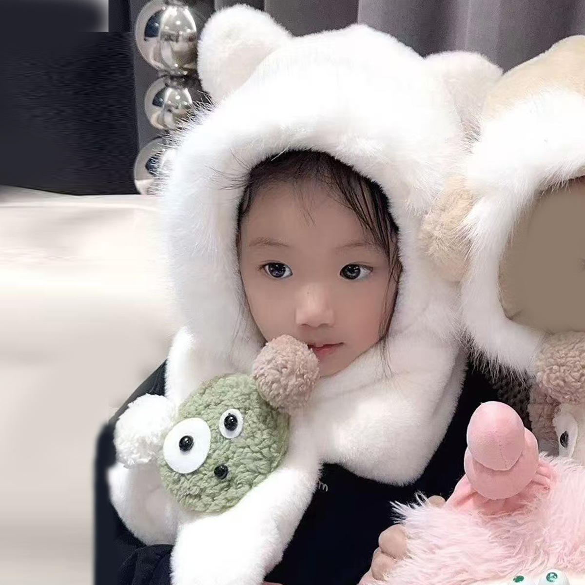 2024 Autumn and Winter Hat, Scarf, Children's cartoon doll, scarf, hat, all-in-one fleece hat for cold and wind protection