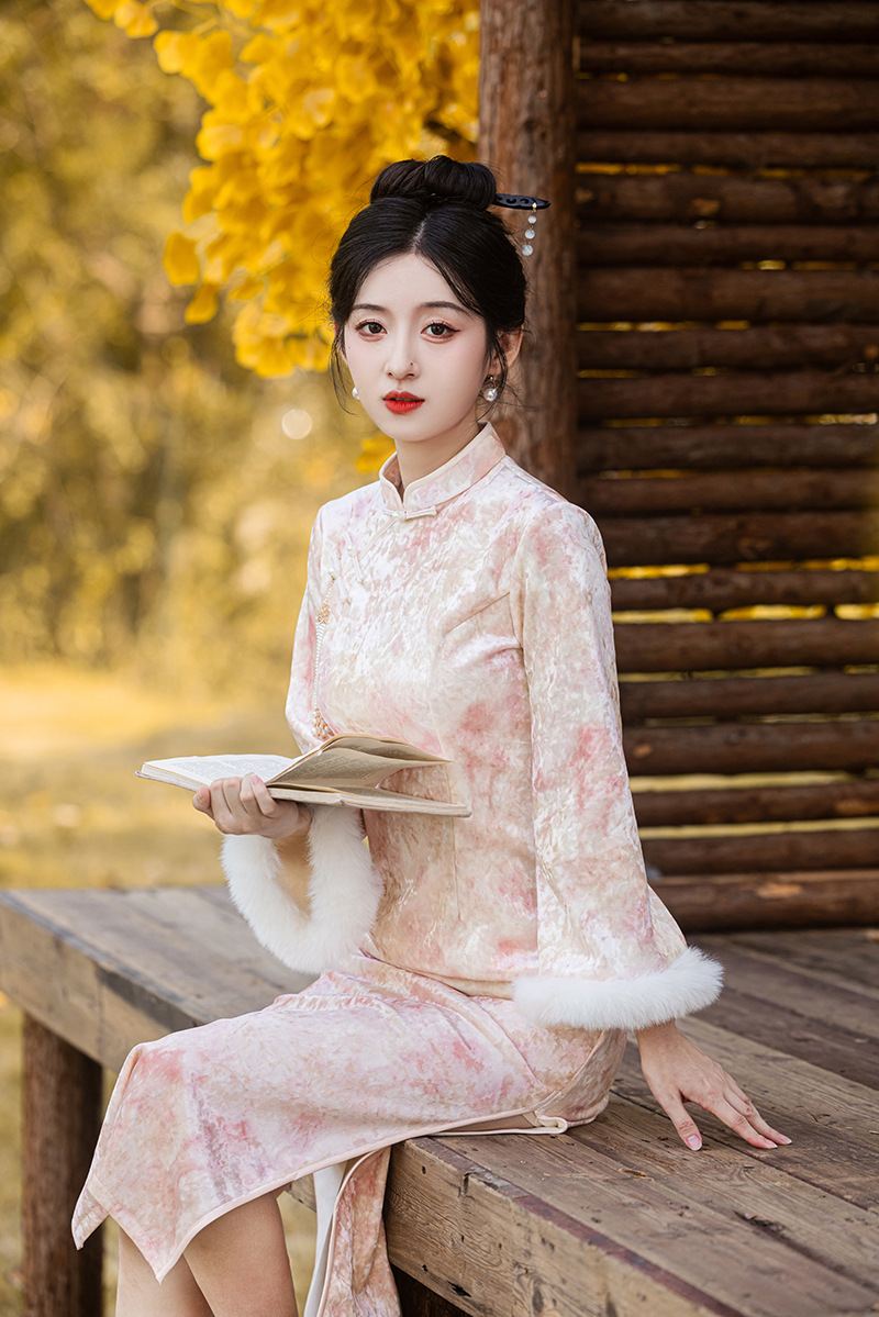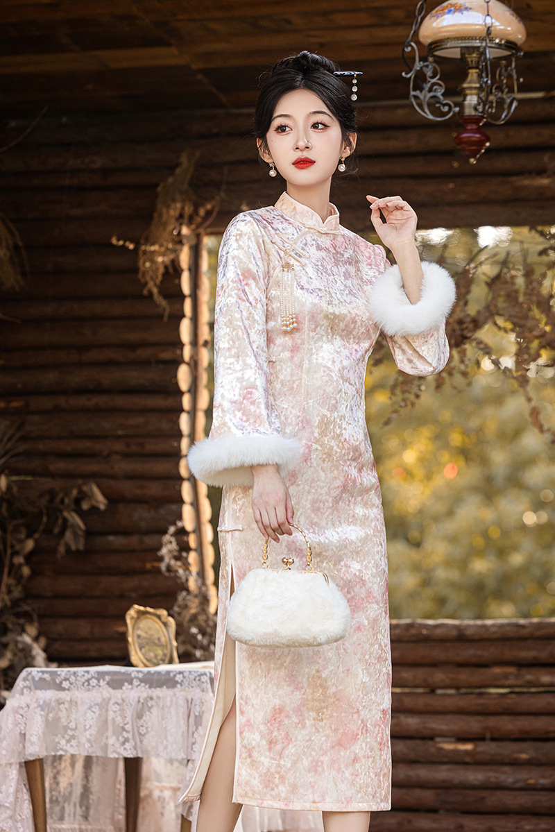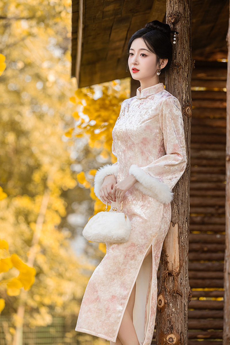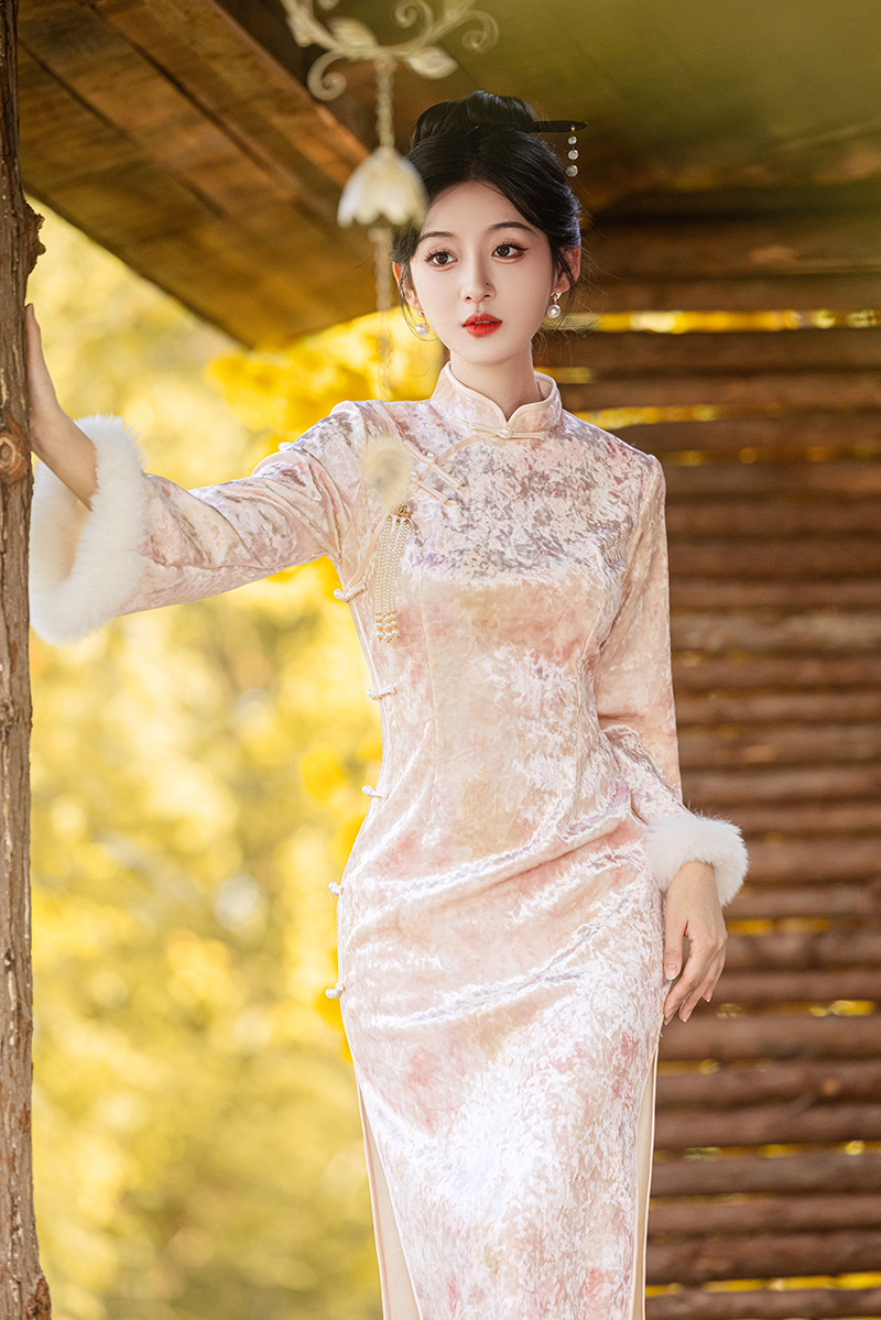 2024 Autumn/Winter Chinese-style pearl velvet thickened long pink cheongsam elegant dress for a young girl's slimming engagement