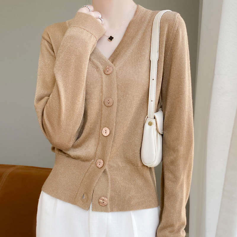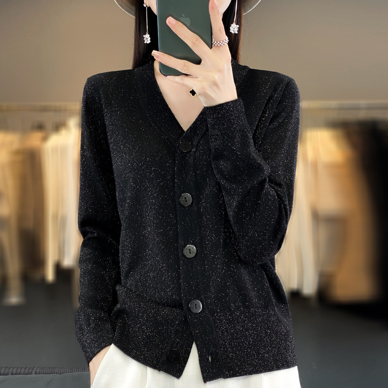 2024 New autumn and winter women's knitted gold and silver shiny silk sweater V-neck cardigan sweater long-sleeved Korean version one-piece shipping