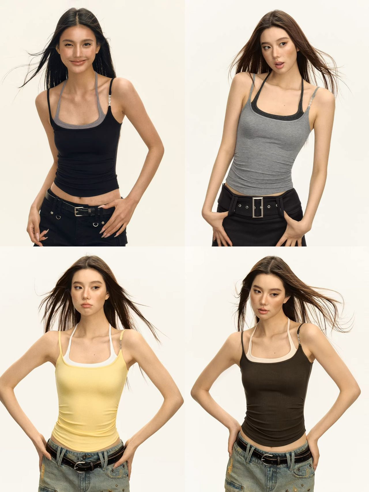 2024 Summer Slim rope Spice Girl style halter T-shirt for petite women, high street American waist-cinching leave, two short tank tops