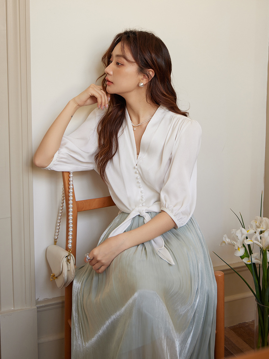起范2024夏季新品法式知性优雅V领女士衬衫宽松显瘦缎面衬衣82911