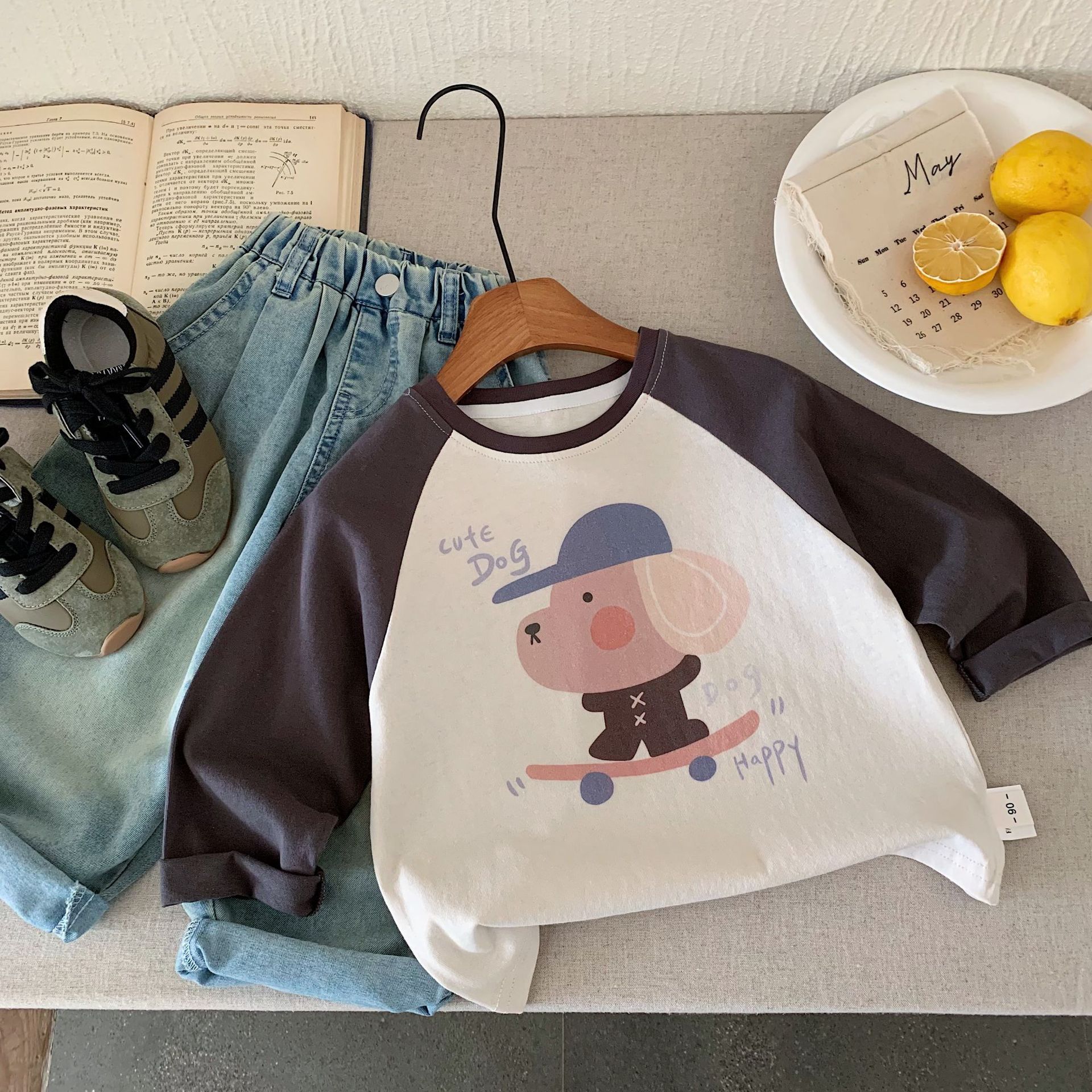 2025 Autumn/Winter Korean children's pure cotton cartoon color-blocking long-sleeved T-shirt, color-blocking shoulder sleeve base layer for boys and girls