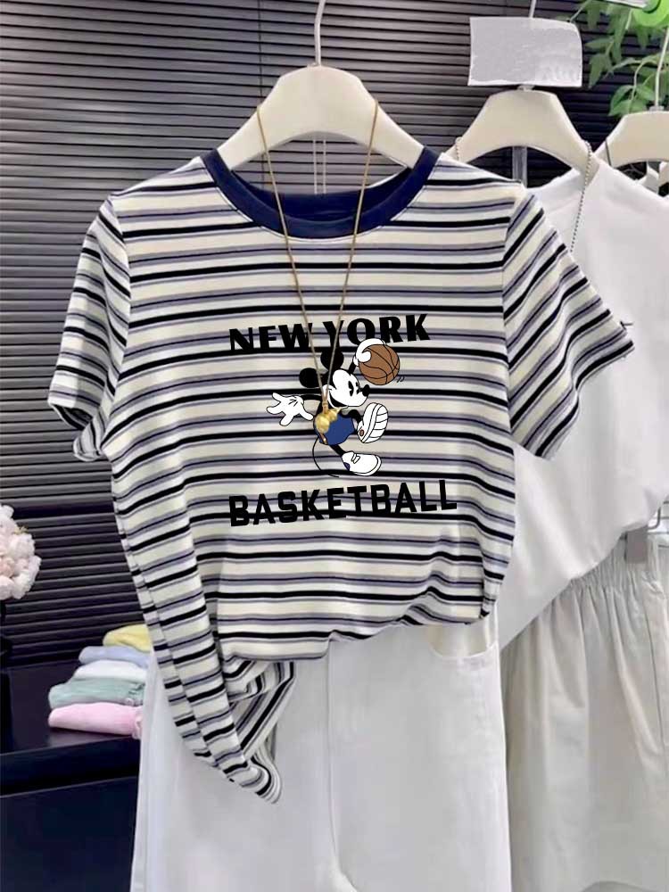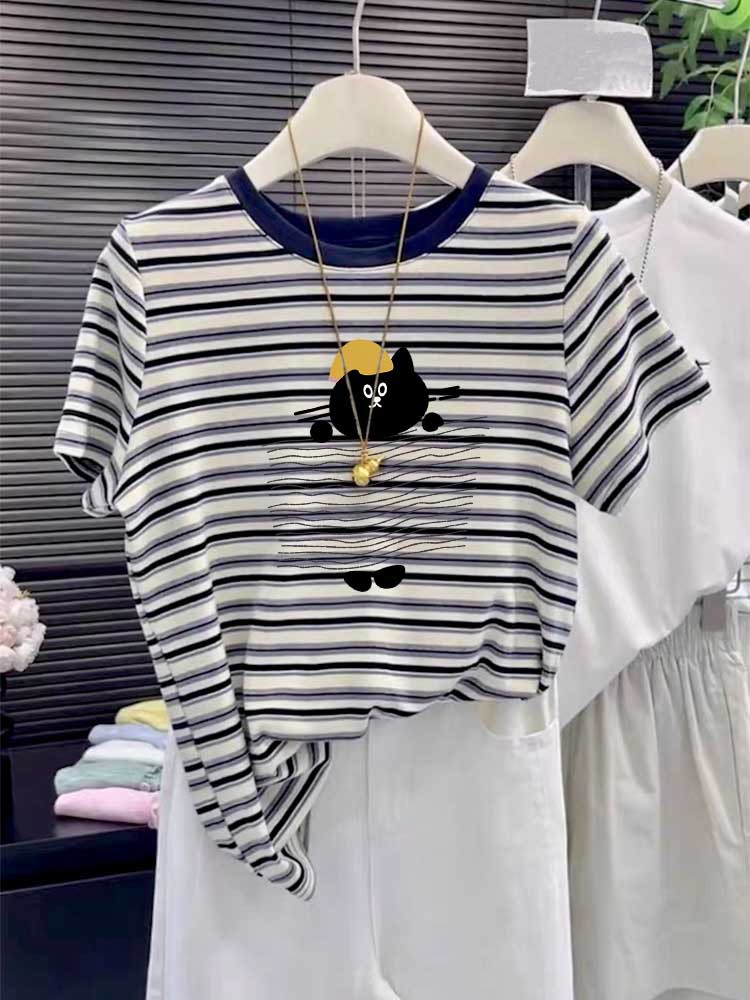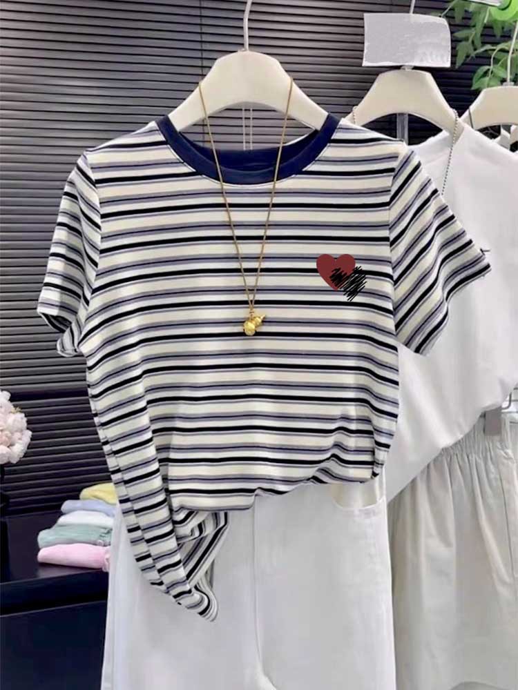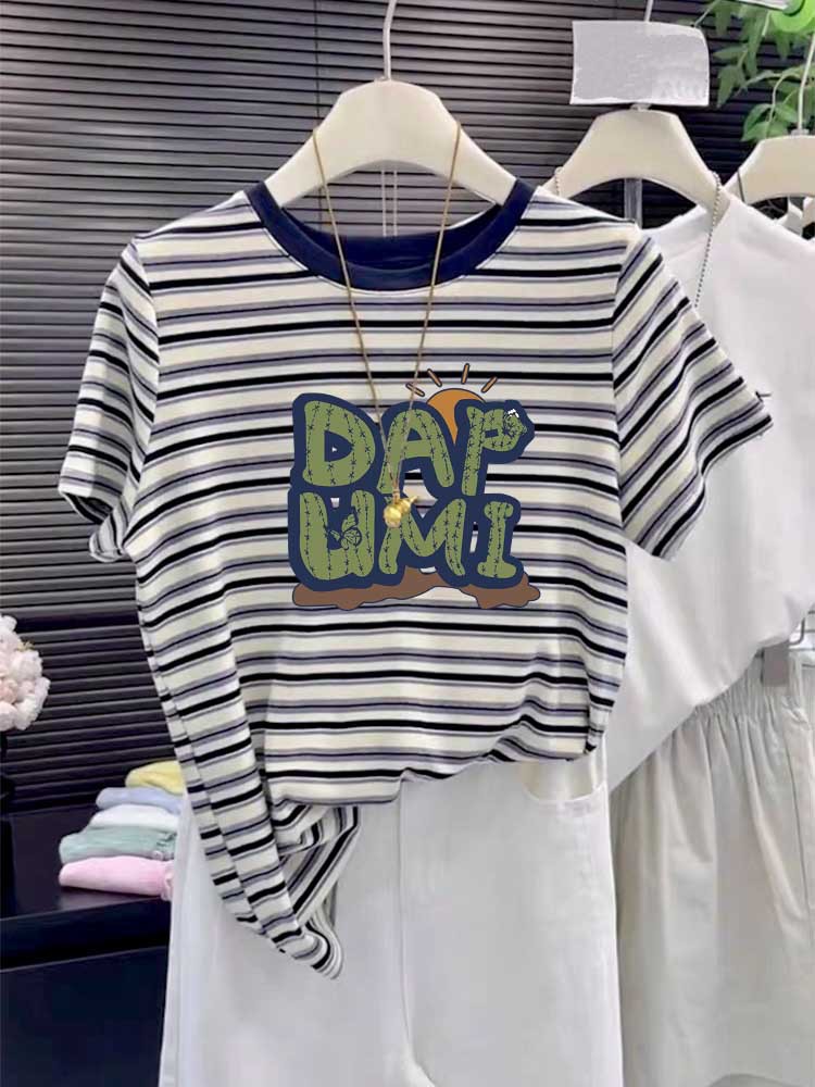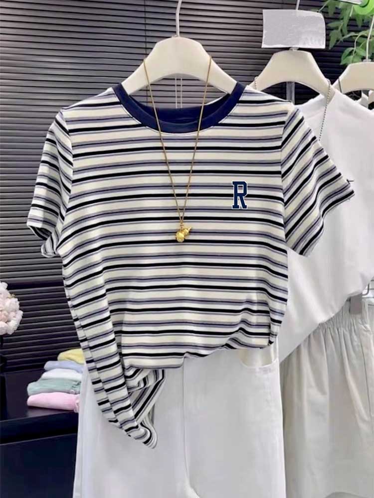 2025 New round-neck pure cotton off-the-shoulder short-sleeved T-shirt for women, fashionable and versatile, slimming striped top base layer for summer