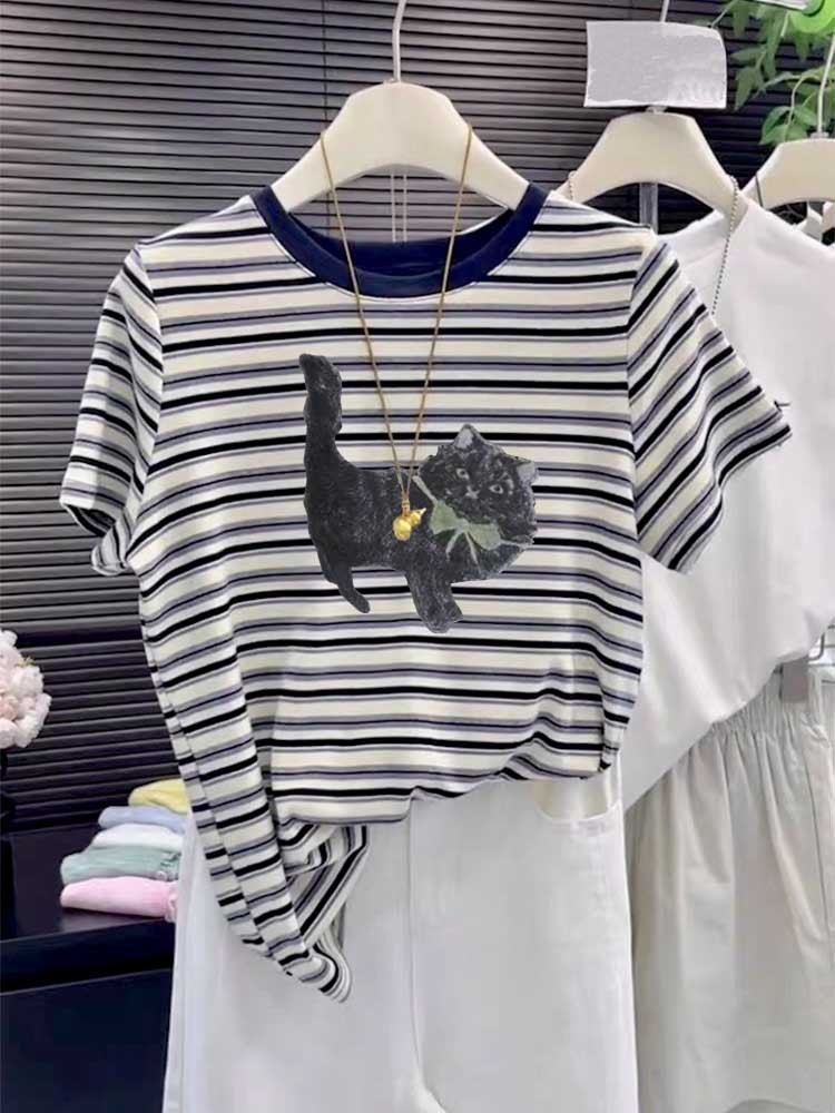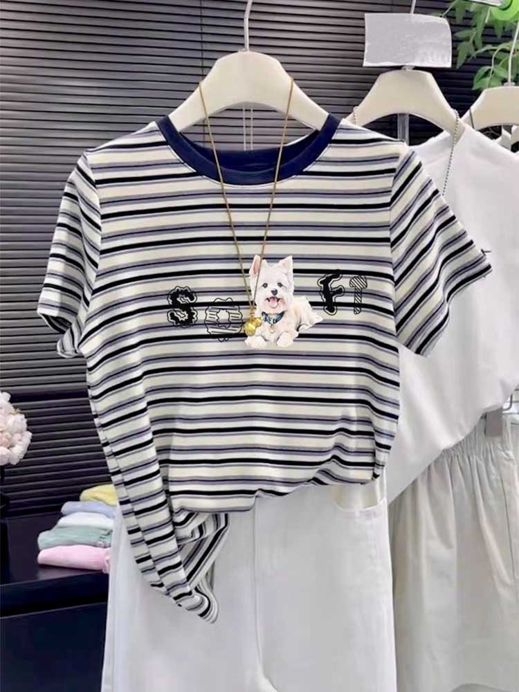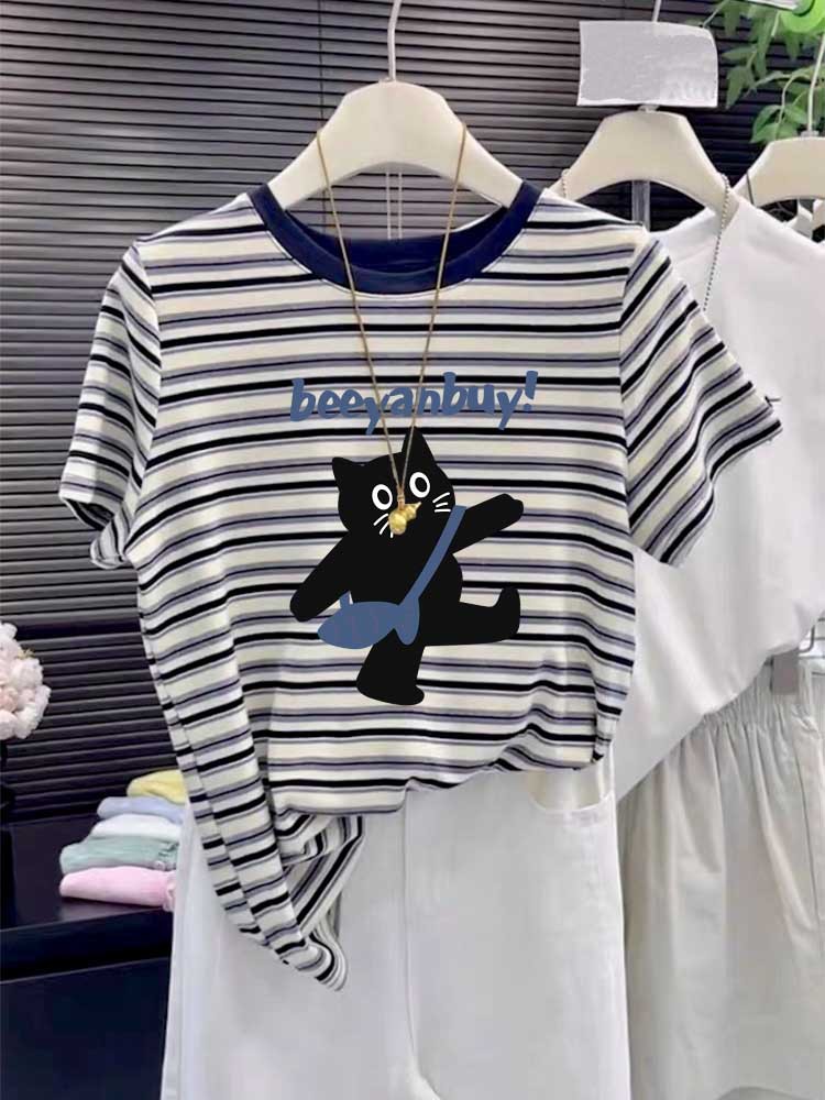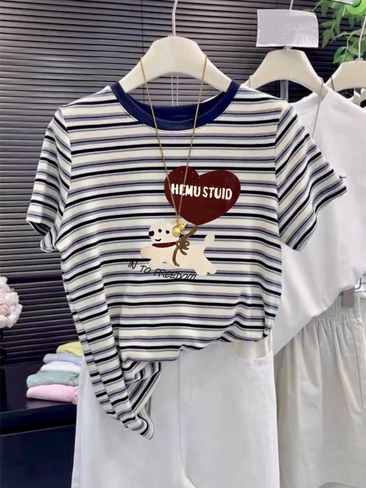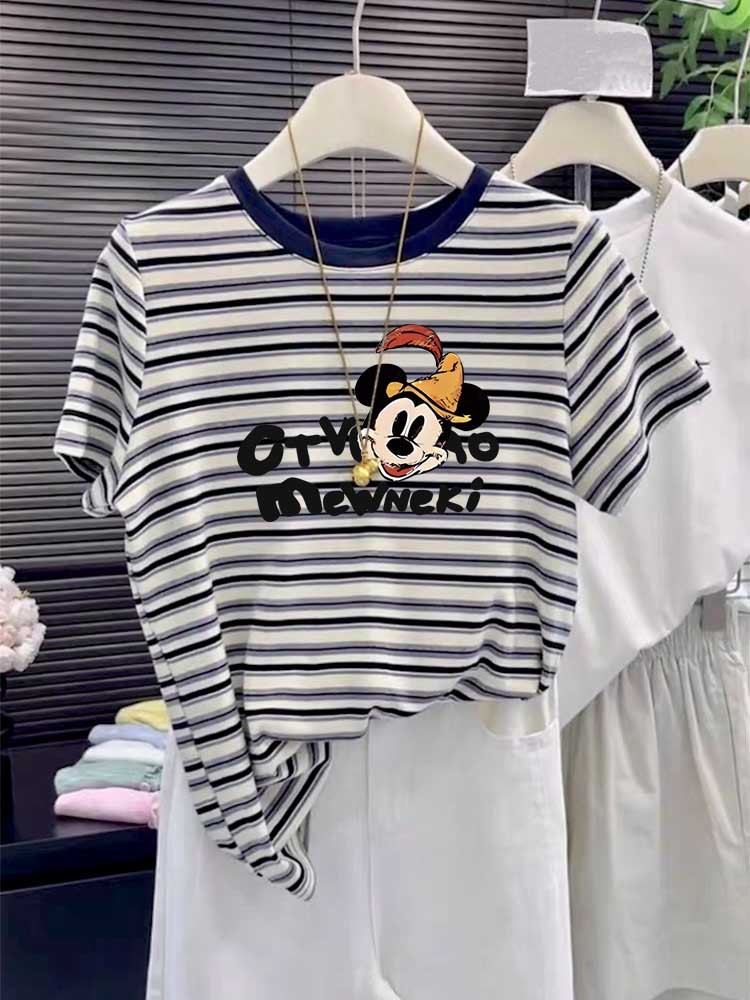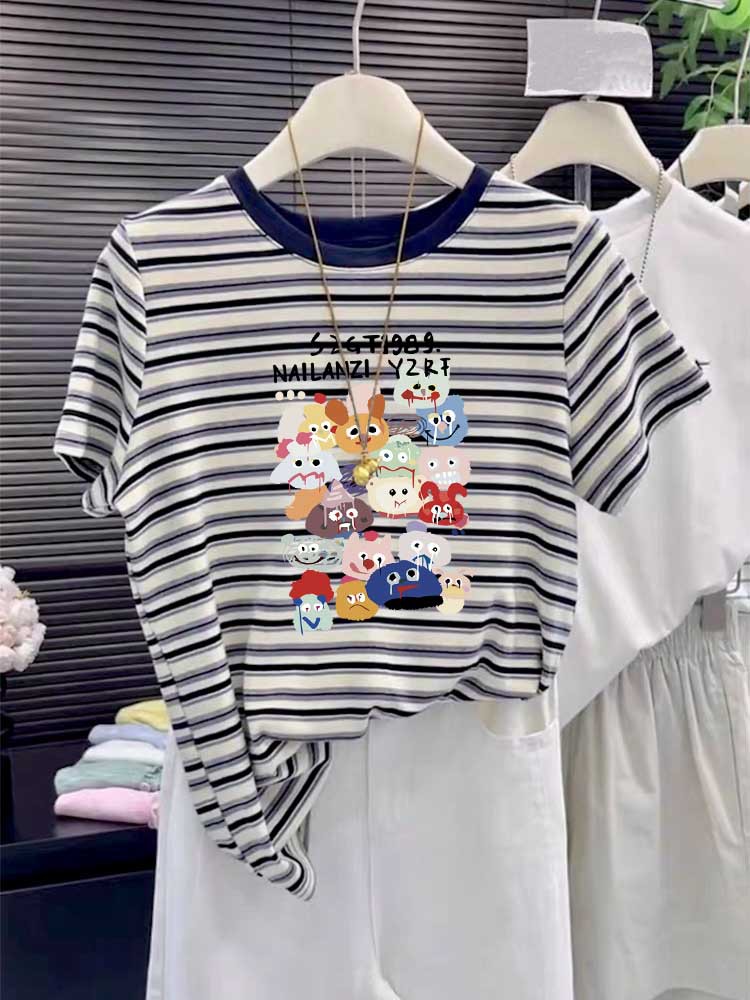 2025 New round-neck pure cotton off-the-shoulder short-sleeved T-shirt for women, fashionable and versatile, slimming striped top base layer for summer