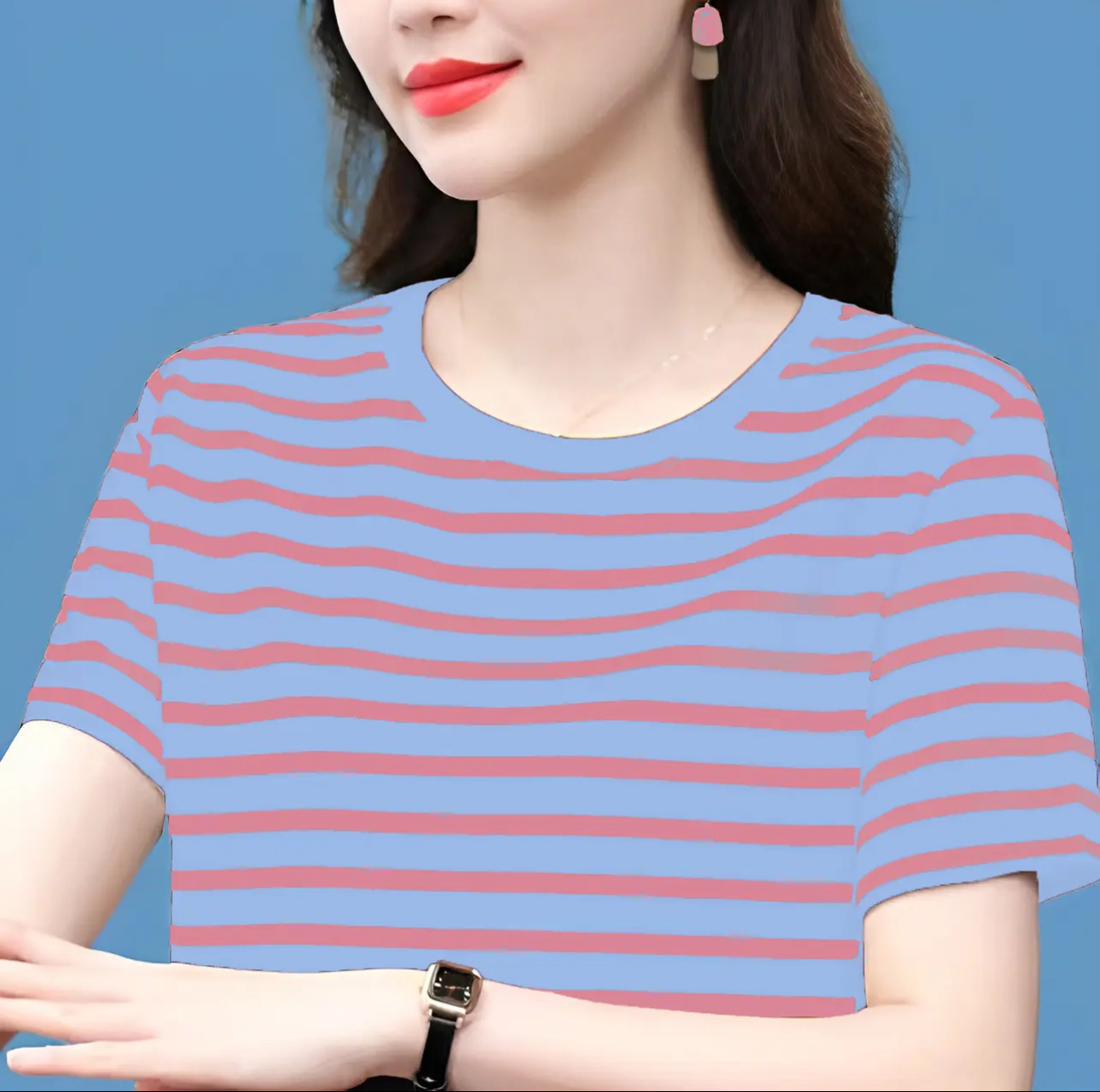 2025 New short-sleeved T-shirt for women, loose and plus-size, summer outfit for middle-aged moms, striped top, stylish mini shirt