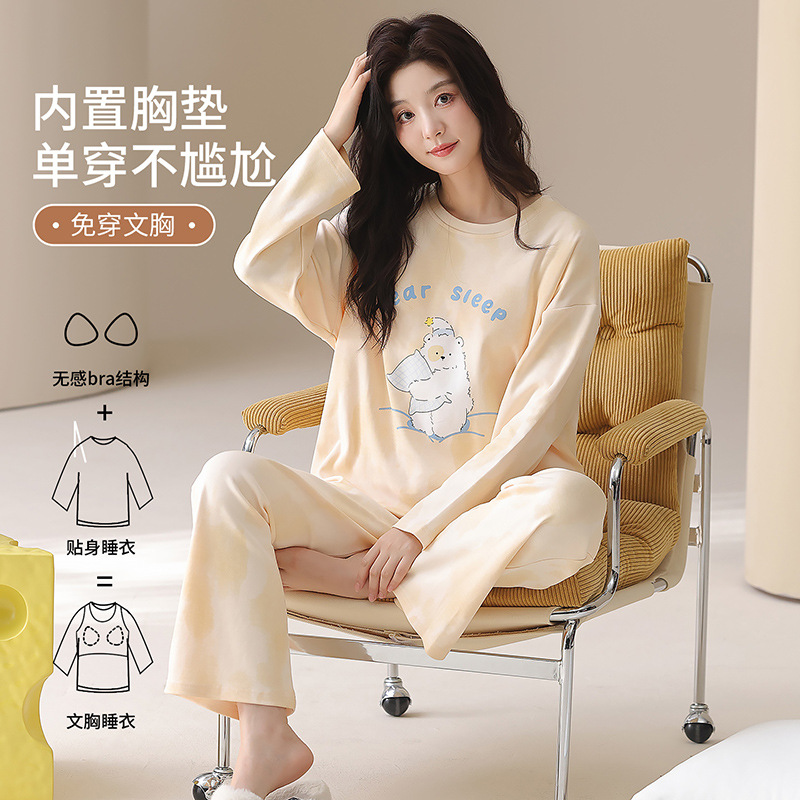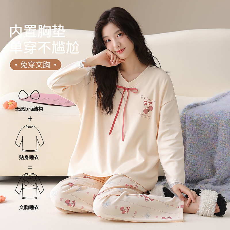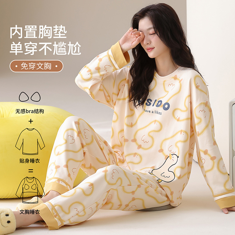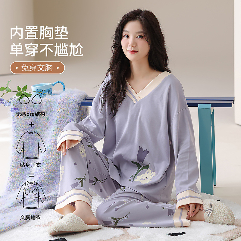 2025 New style pajamas for women in autumn, pure cotton with built-in chest pads, long-sleeved round neck, casual and suitable for outerwear, home wear set