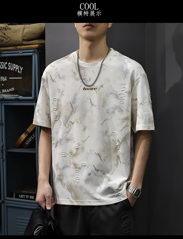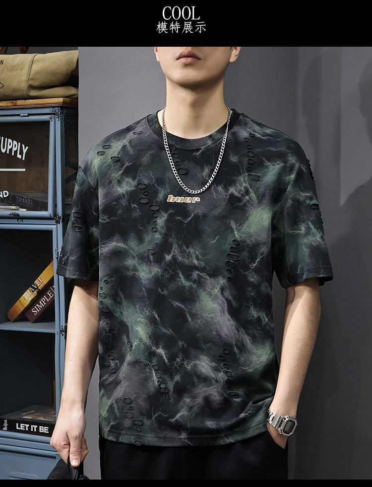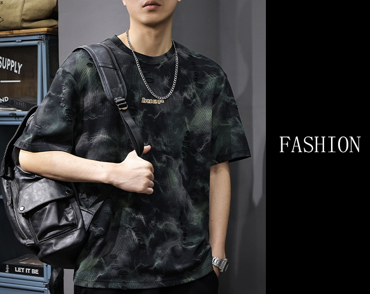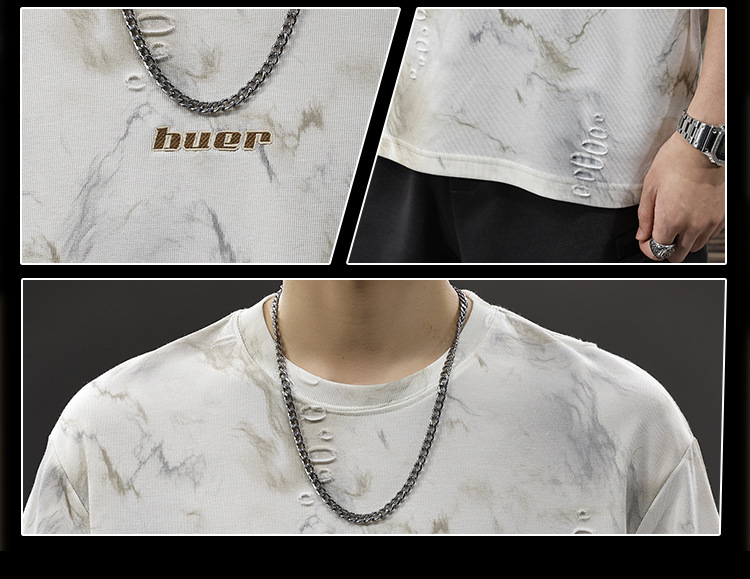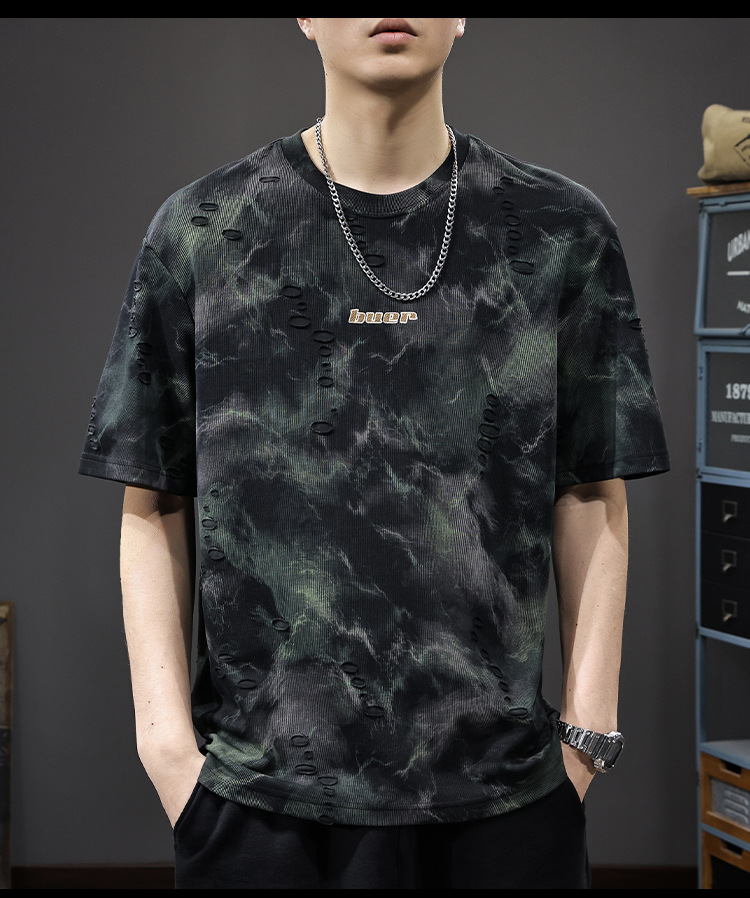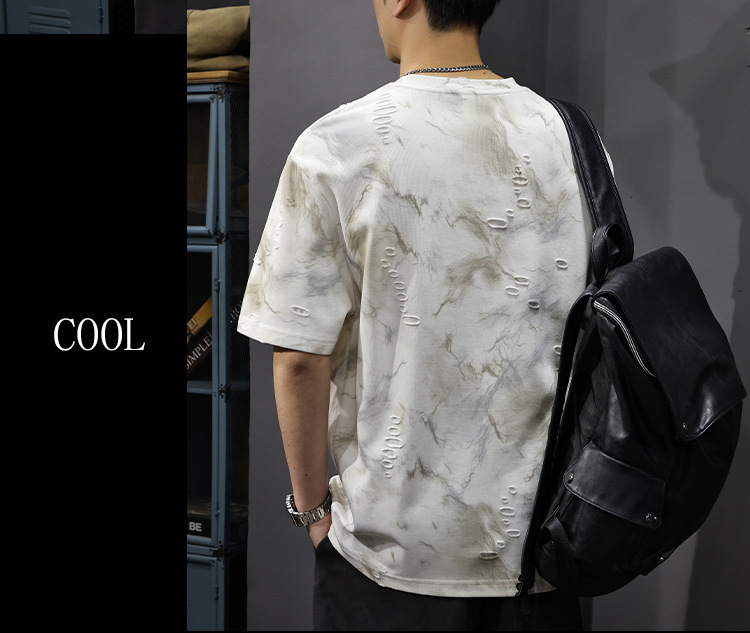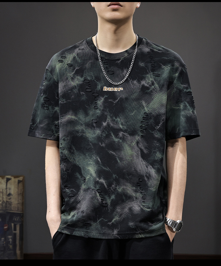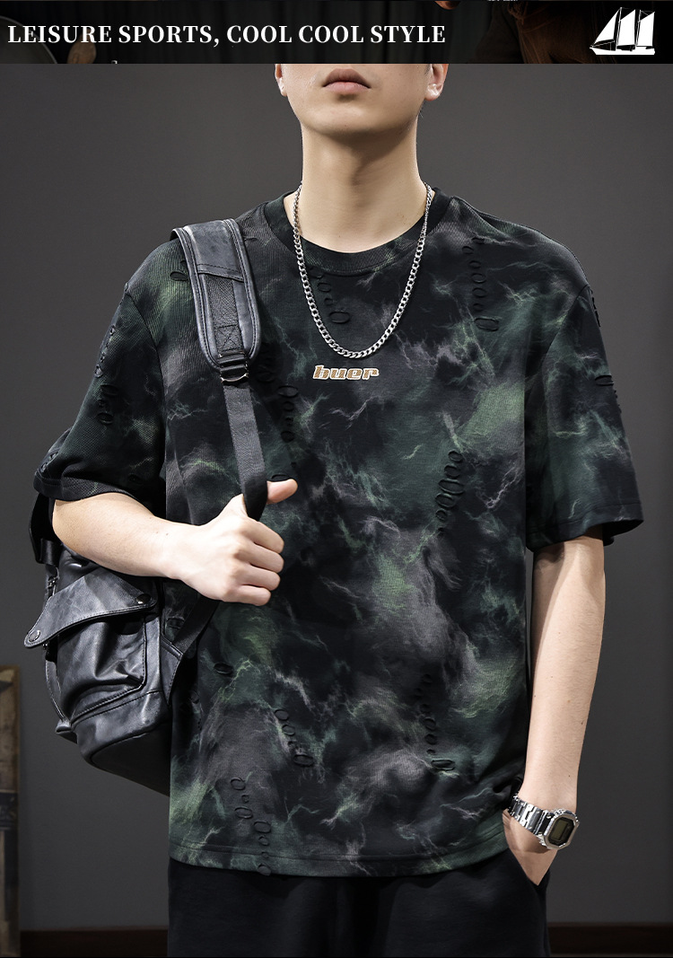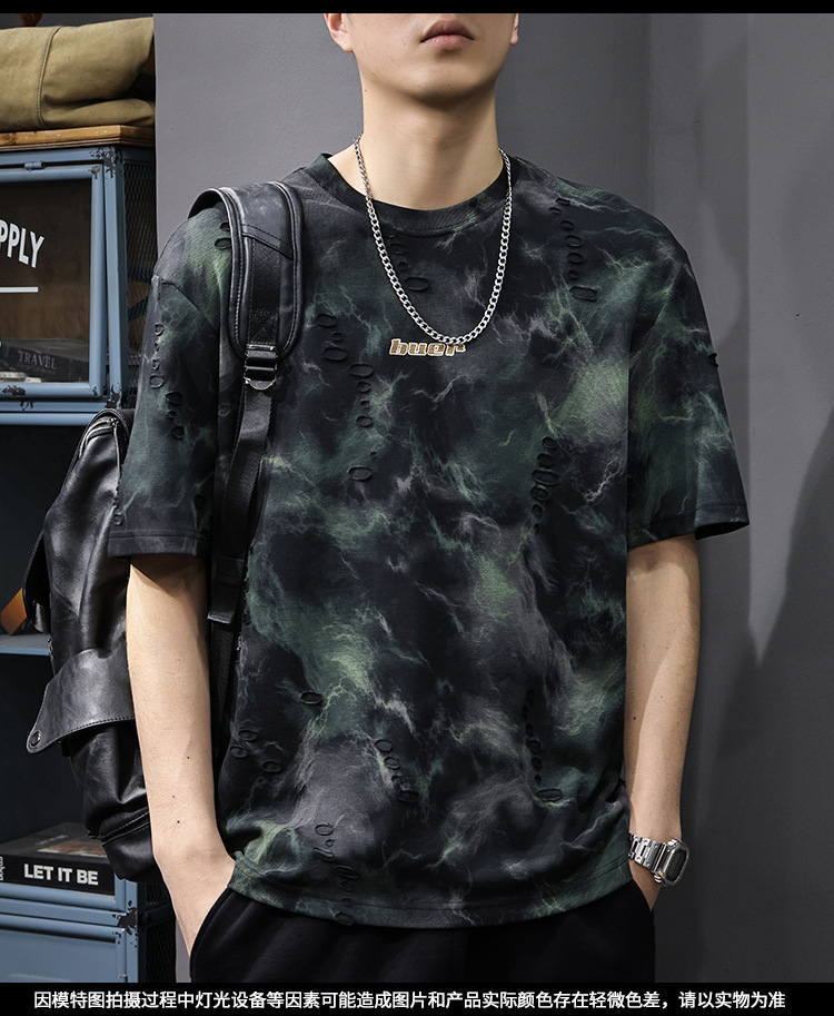 2025 New top fashion brand, thin short-sleeved T-shirt, men's loose and casual summer fake, cool half-sleeved shirt with holes