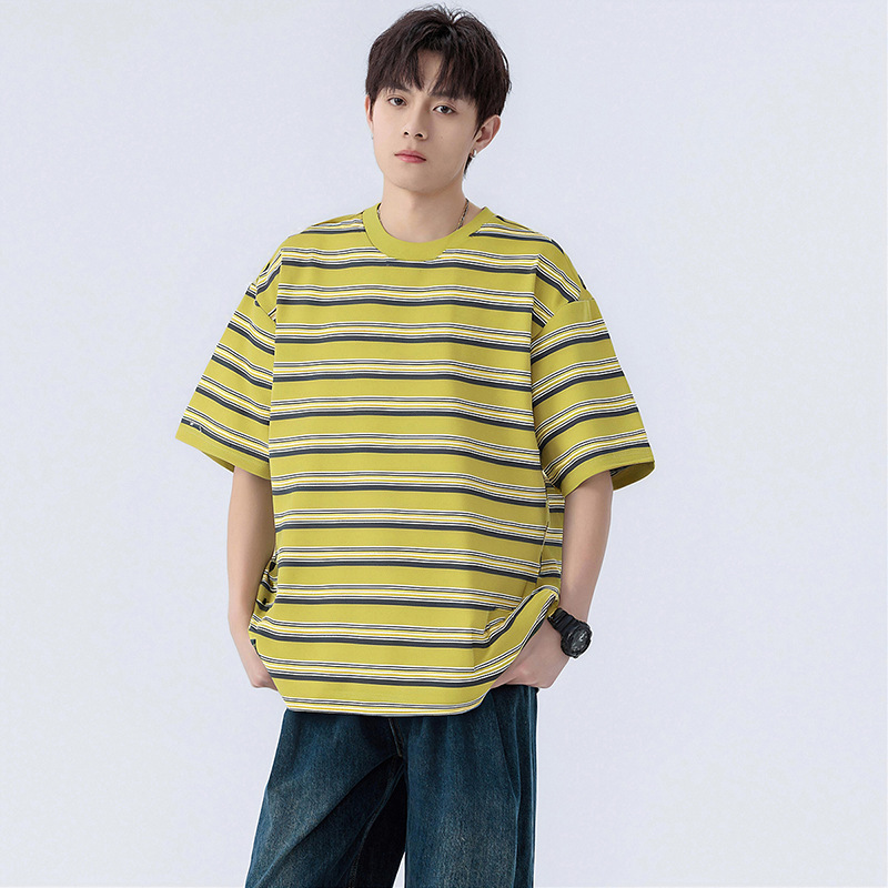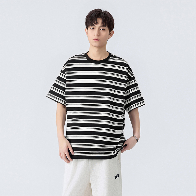 2025 Round-neck striped T-shirt for men, loose wide-sleeved half-sleeve T-shirt, trendy, cool and casual men's wear
