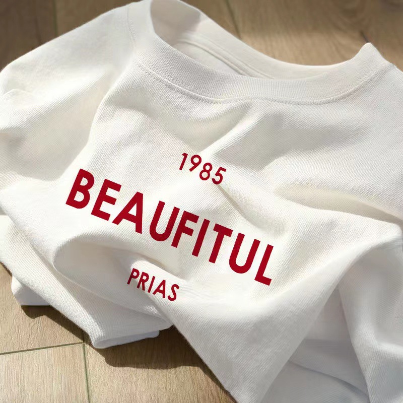 2025 Summer New apricot-colored pure cotton short-sleeved T-shirt for women, loose American letter print top, ins couple half-sleeved