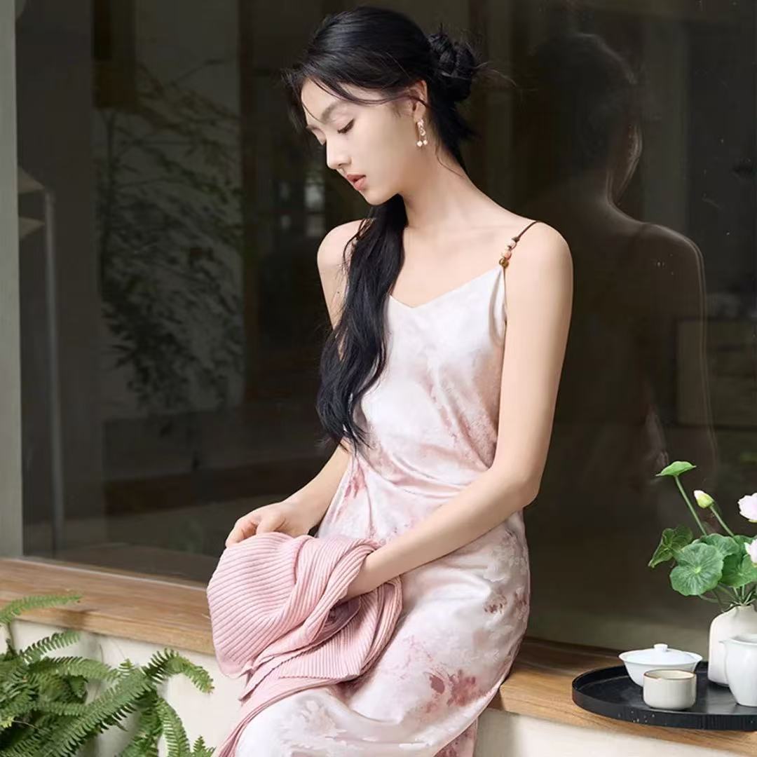 2025 Summer satin V-neck halter dress for women, new Chinese-style smudged printed dress