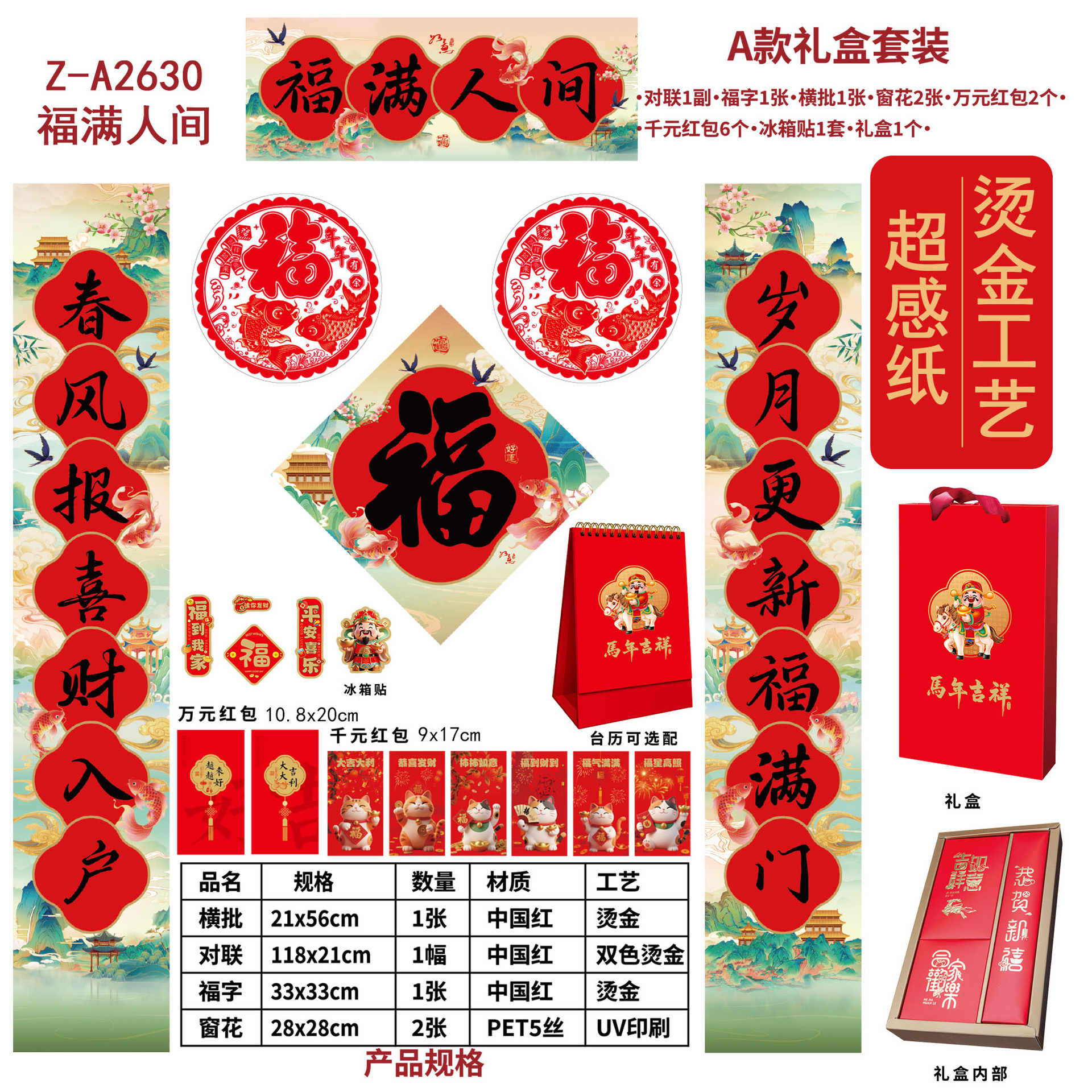 2026 Year of the Horse Silk Couplet Gift Pack, Spring Festival Couplet and "Fu" Character Gift Bag, Red Envelope Window Flower Set Gift Bag, Advertising Magnetic Couplet