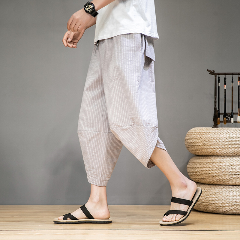220K14 radish pants for men, summer Chinese-style cotton and linen striped pants, oversized wide-leg Haren beach capri pants for men