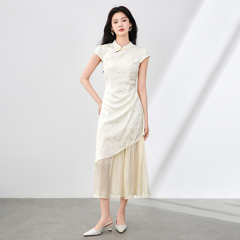 2507105- New Chinese-style traditional Chinese style waist-cinching pleated button-up patchwork butterfly jacquard dress for women, new improved cheongsam