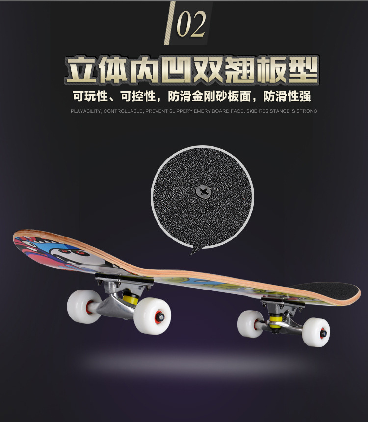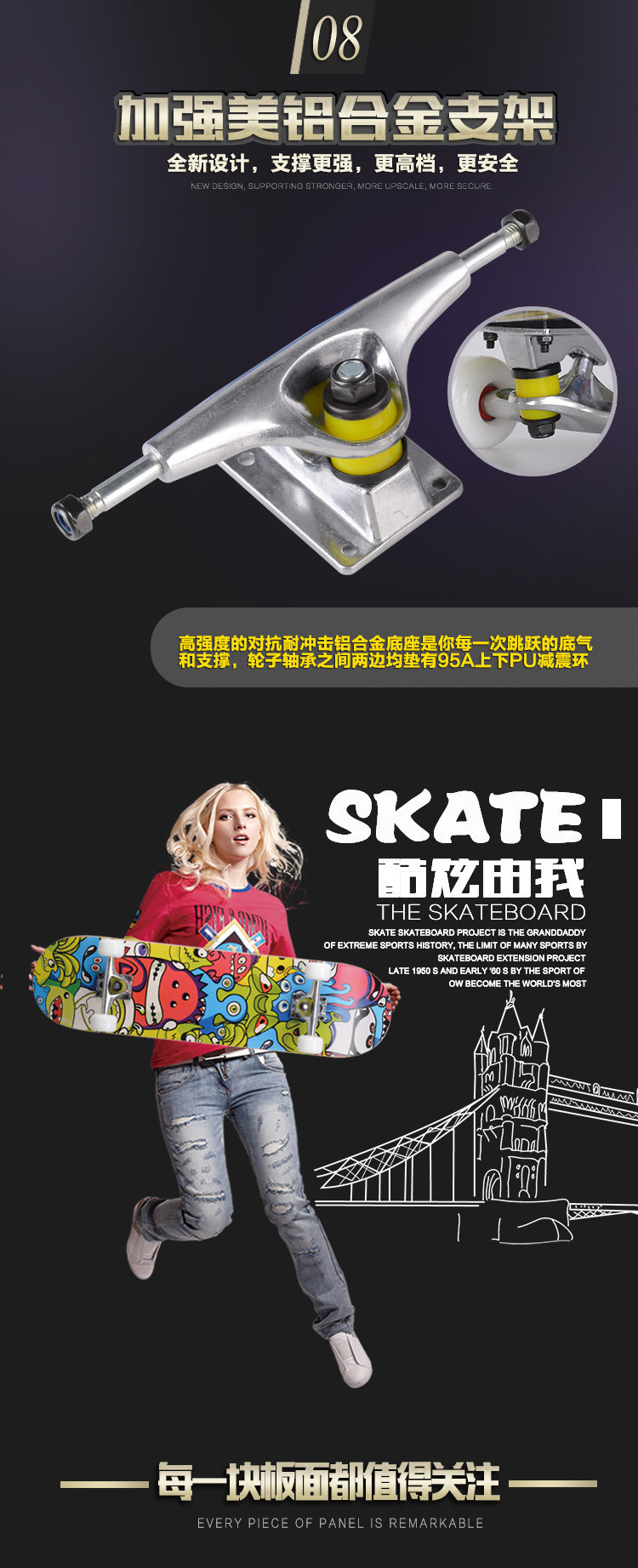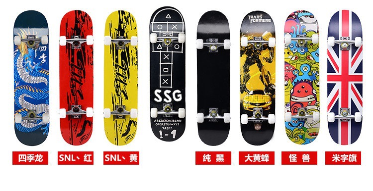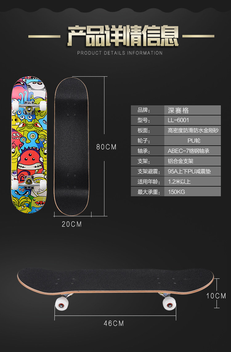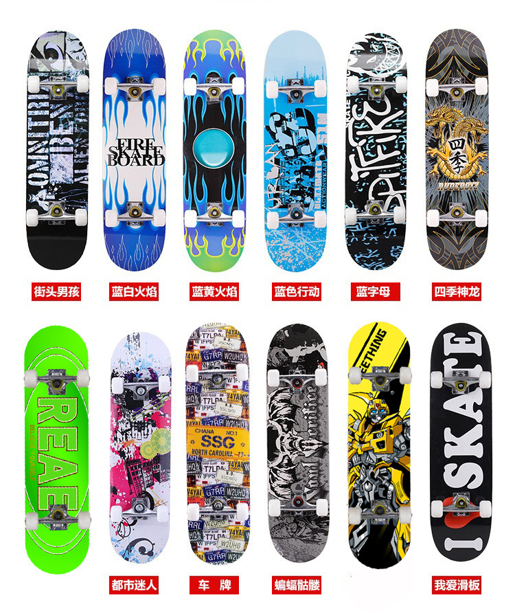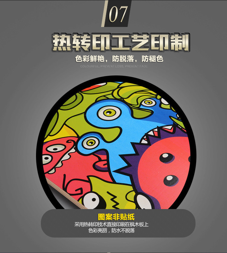 Heat transfer printing process skateboard: Maple wood surface, aluminum alloy frame (load-bearing capacity 300 jin, suitable for both adults and children), bottom pattern heat transfer printing - pattern surface waterproof, board surface black diamond matte leather (waterproof, anti-slip and wear-resistant)