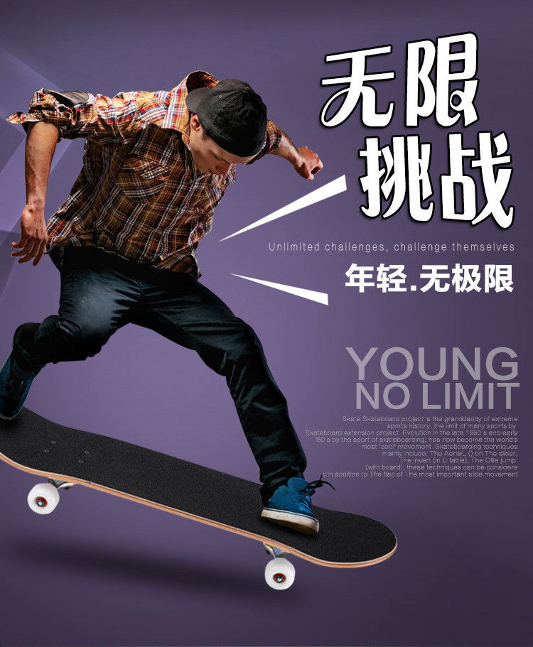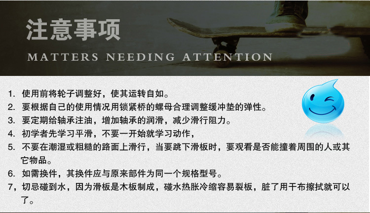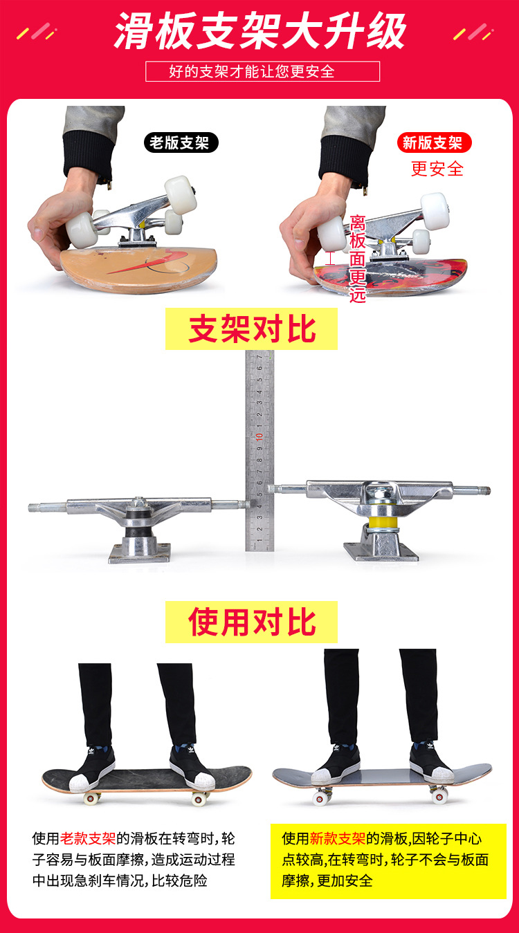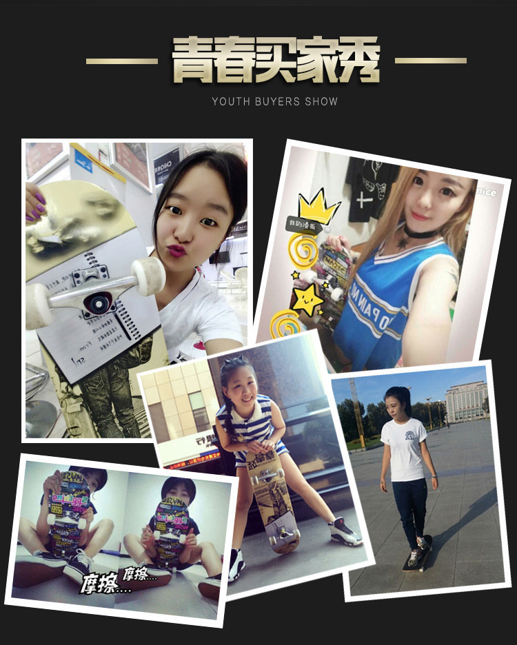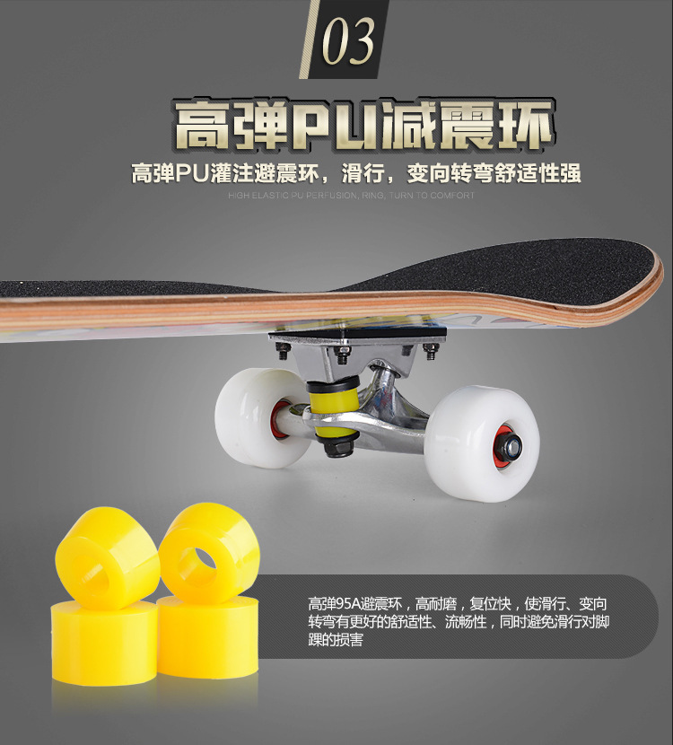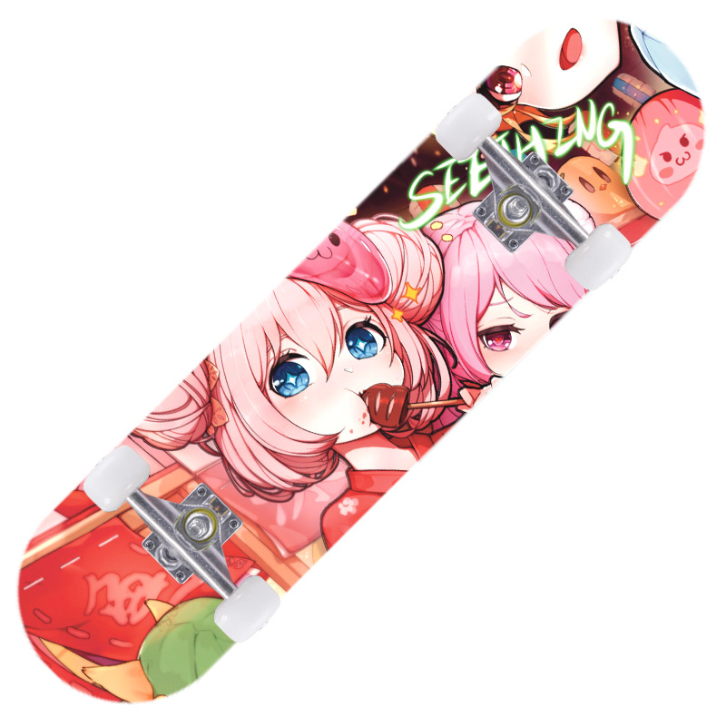 Heat transfer printing process skateboard: Maple wood surface, aluminum alloy frame (load-bearing capacity 300 jin, suitable for both adults and children), bottom pattern heat transfer printing - pattern surface waterproof, board surface black diamond matte leather (waterproof, anti-slip and wear-resistant)