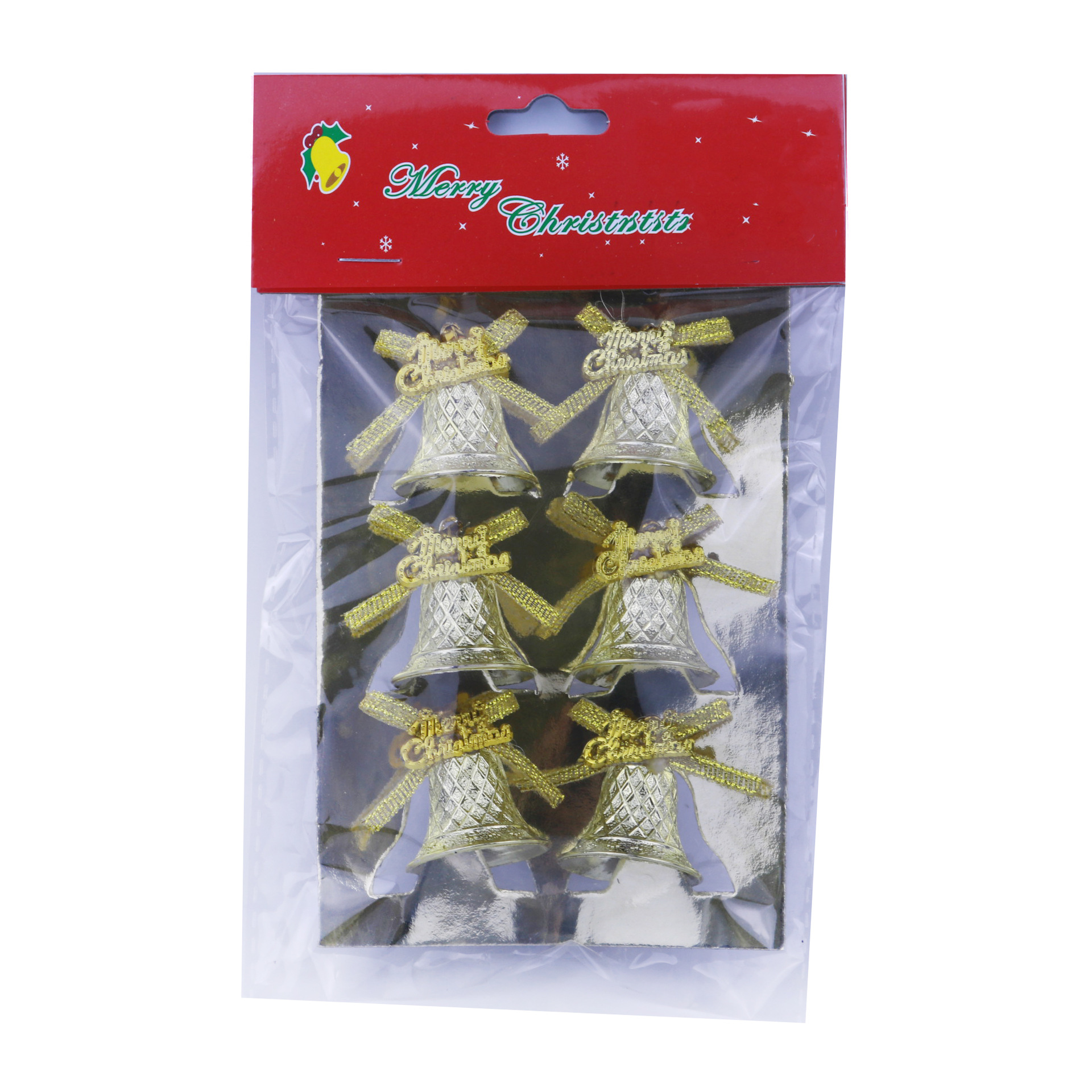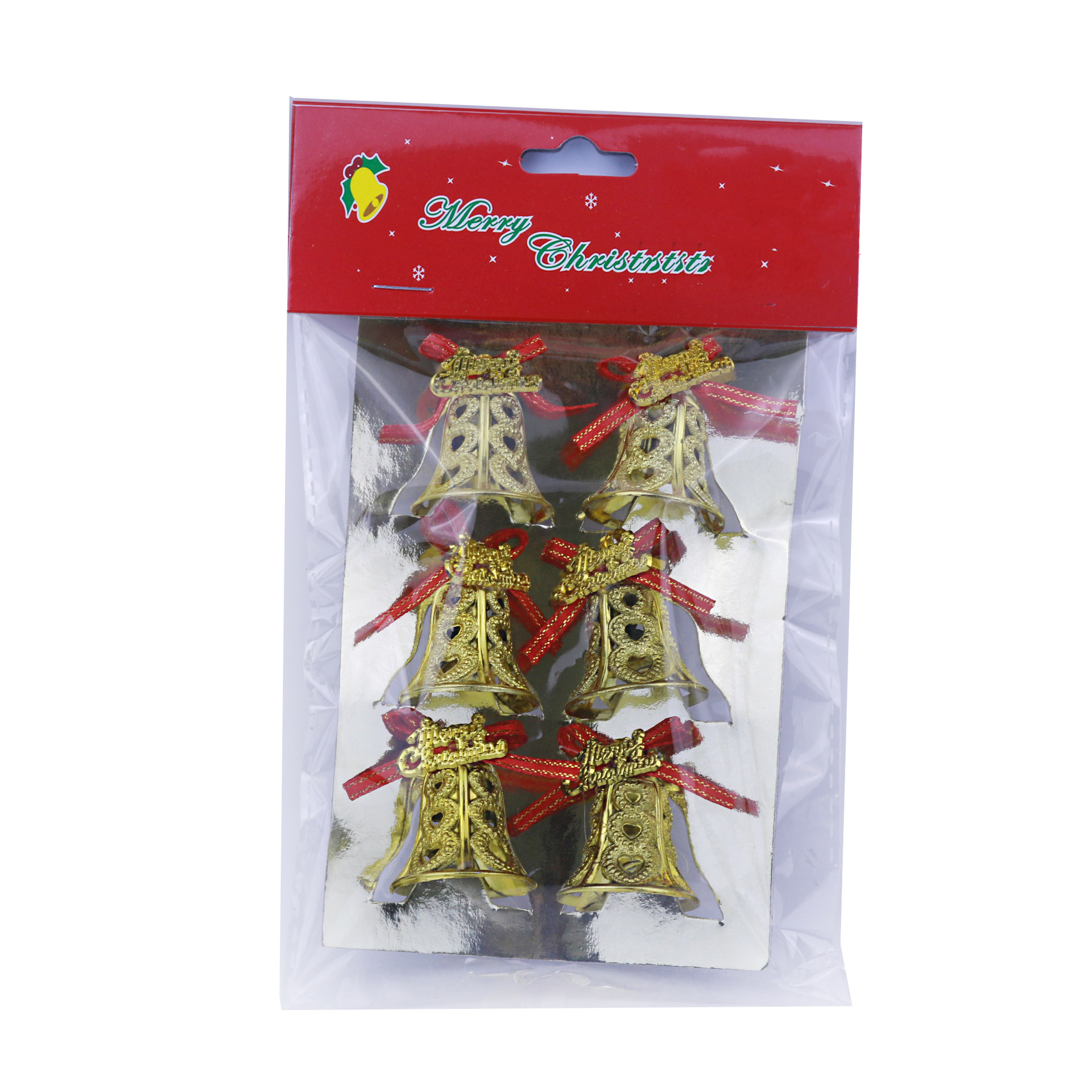 3cm 6 per card Christmas tree bell decorative pendant, large Christmas bell with sticky word tag and bow, factory direct sales