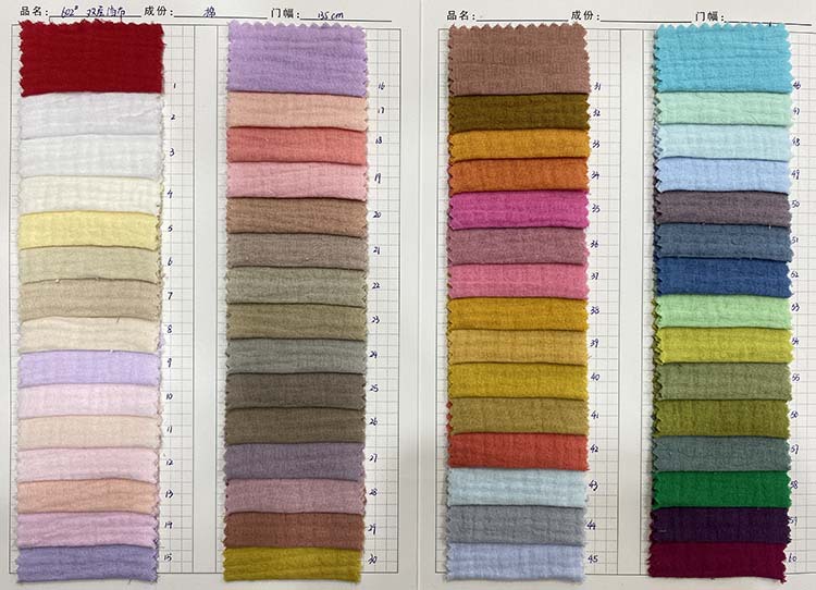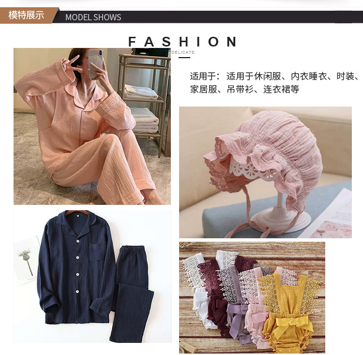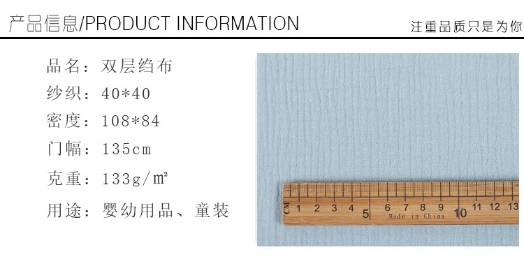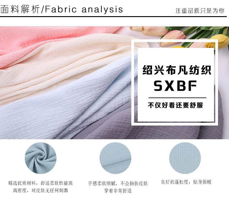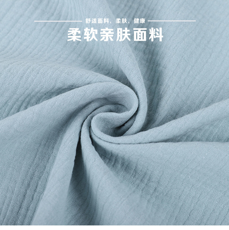 Double-layer washed gauze, with good moisture absorption and breathability, soft and delicate touch, healthy and environmentally friendly.