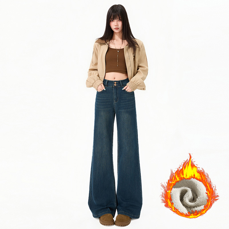 5588's autumn and winter collection features new stretch fleece high-waisted double-button wide-leg floor-length jeans with a loose and draping feel for women