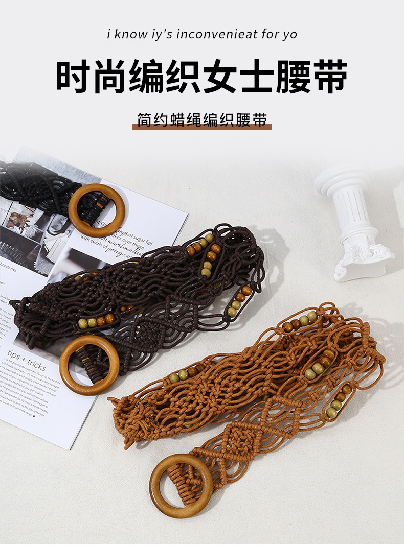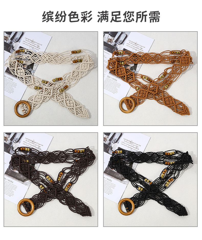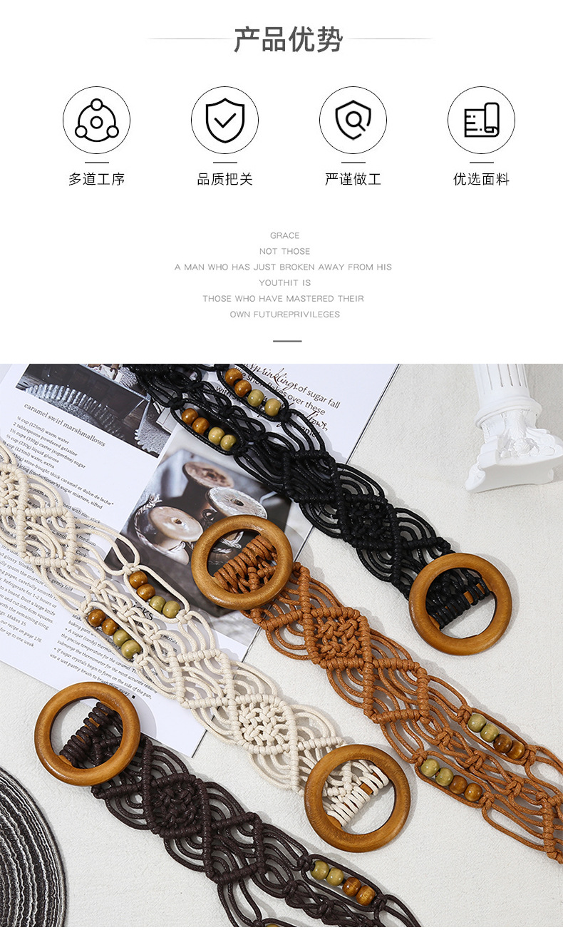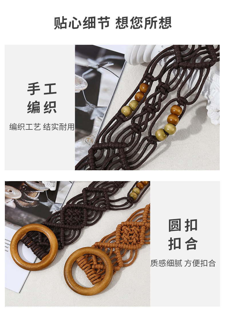 欧美跨境新款复古花纹纯手工蜡绳编织木扣装饰腰带民族风腰链