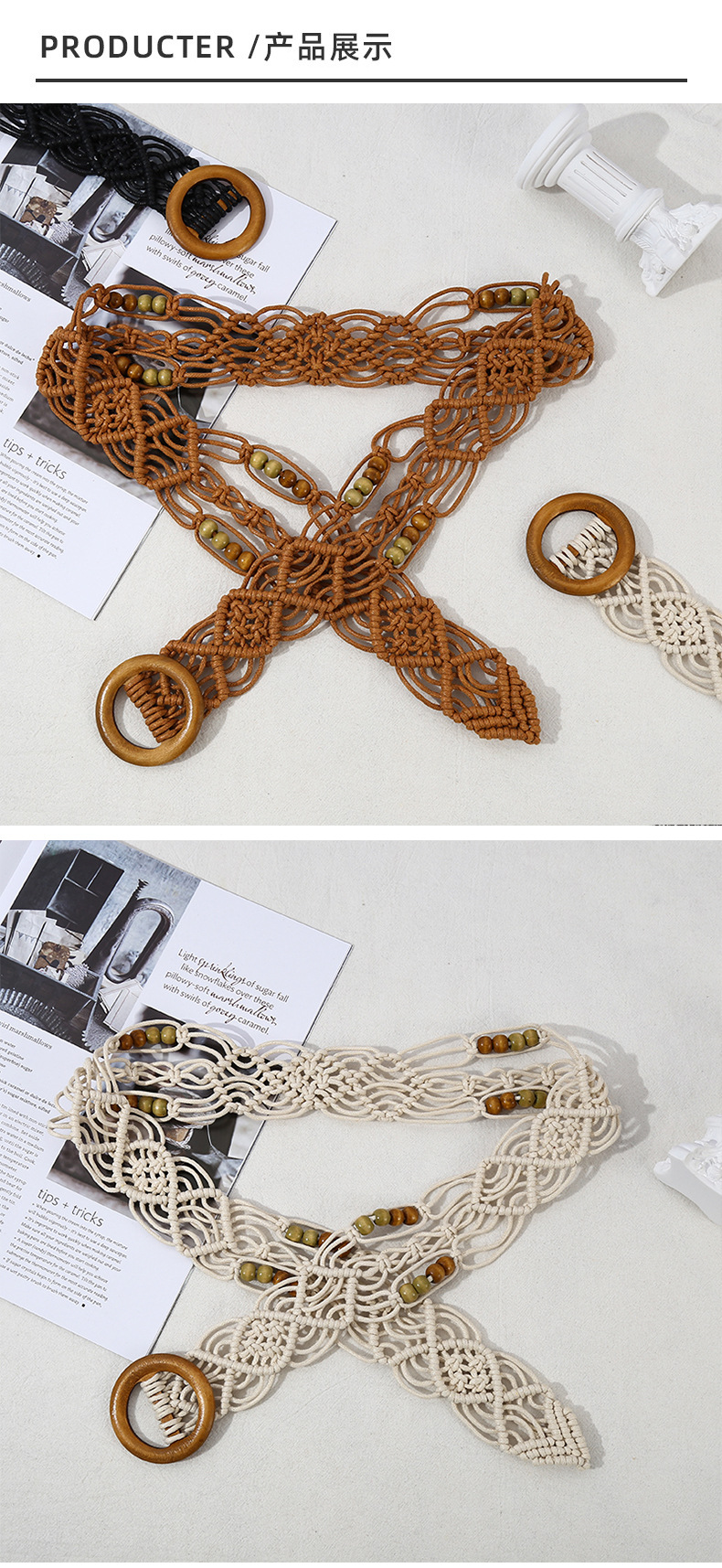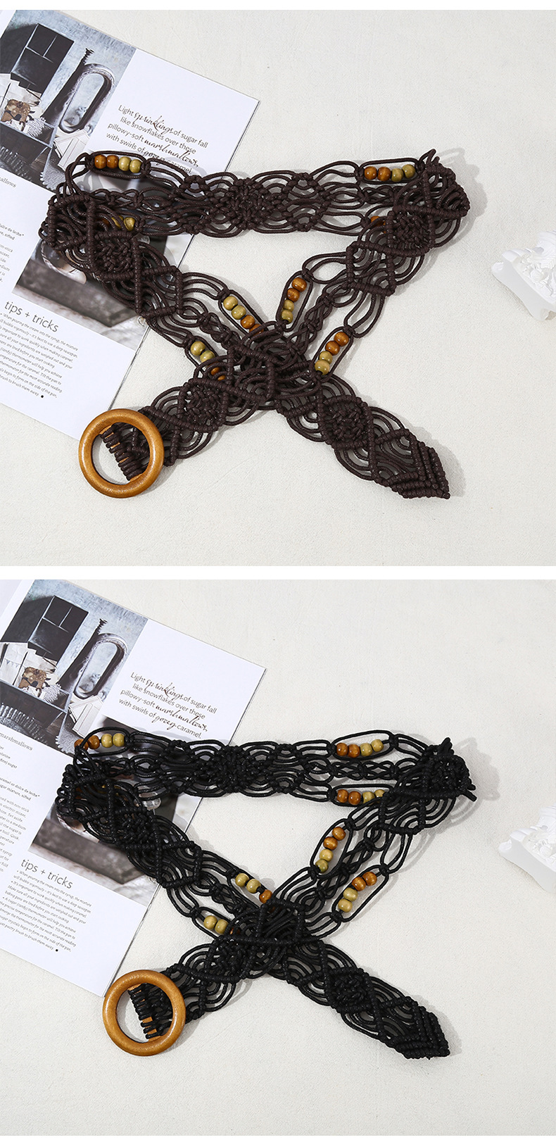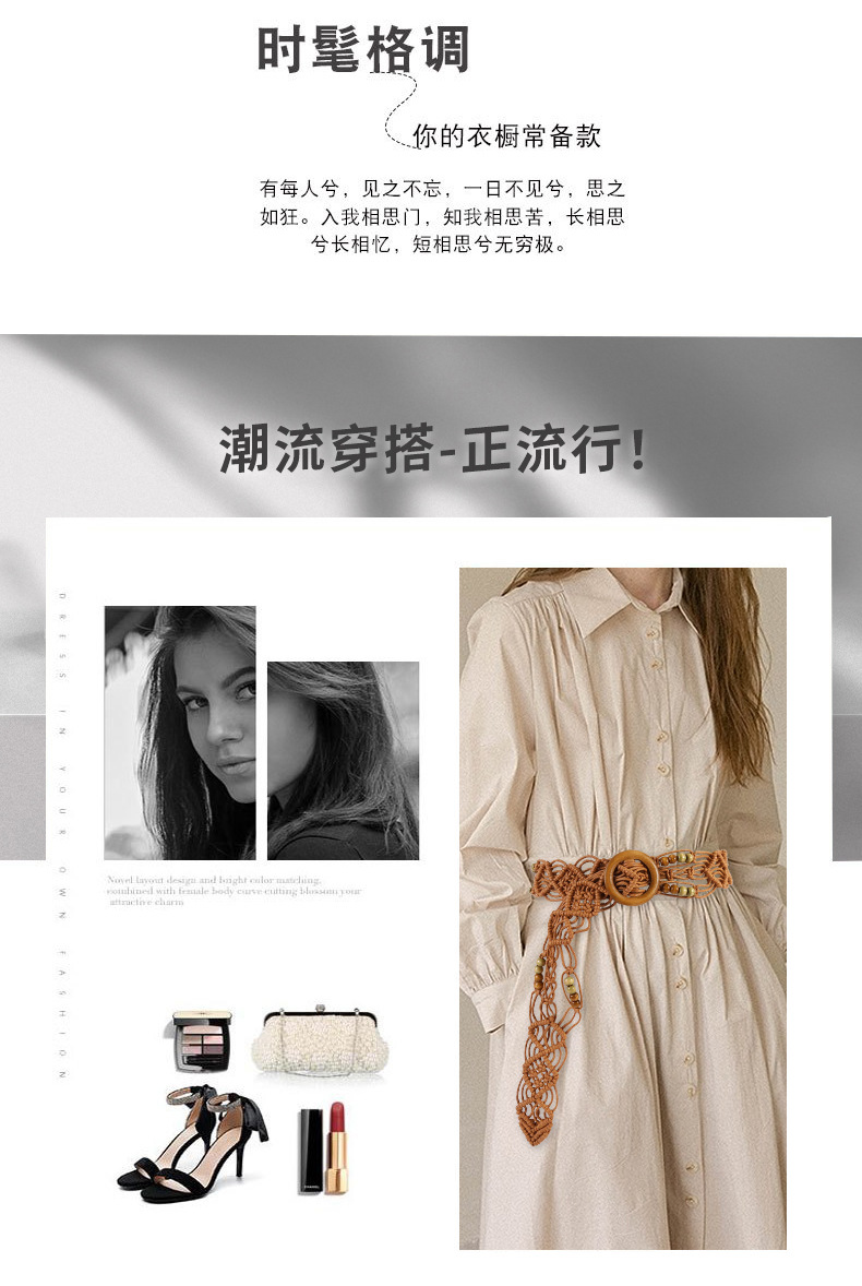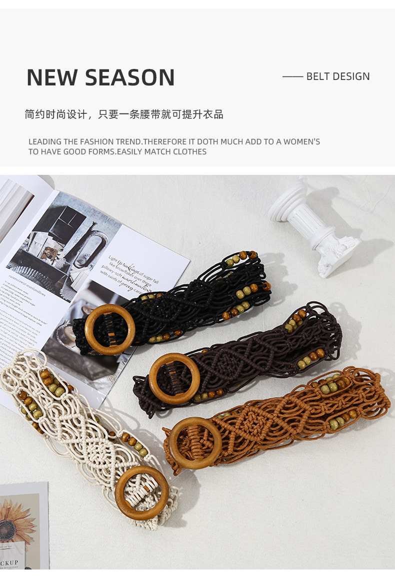 欧美跨境新款复古花纹纯手工蜡绳编织木扣装饰腰带民族风腰链