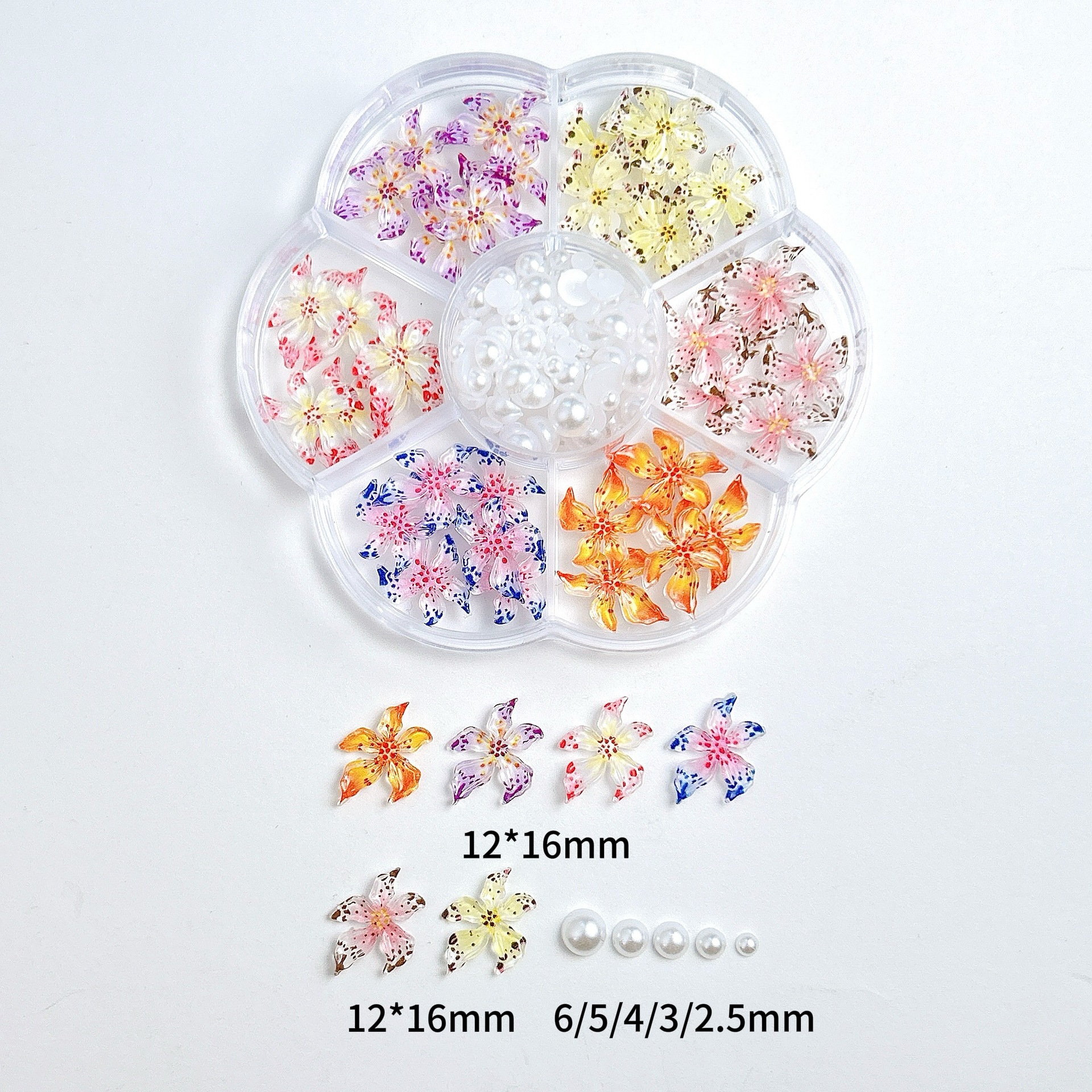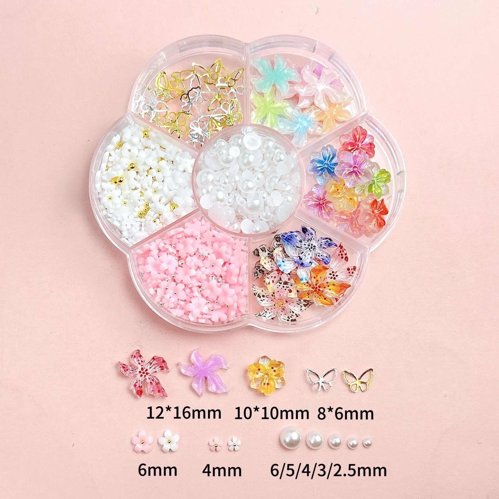 7-compartment plum blossom box nail art accessory set, resin butterfly, bee, Daisy, flower, semi-circular pearl diy material set