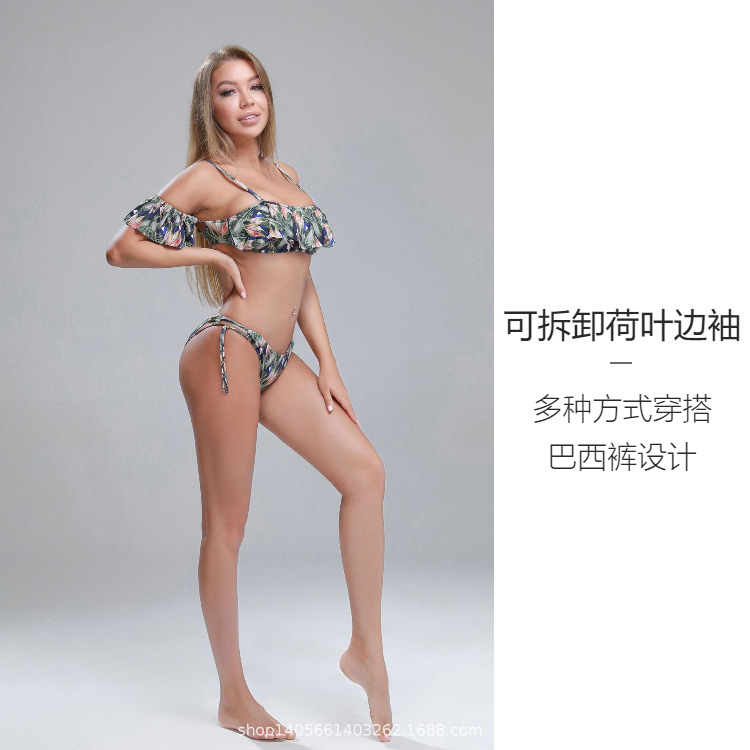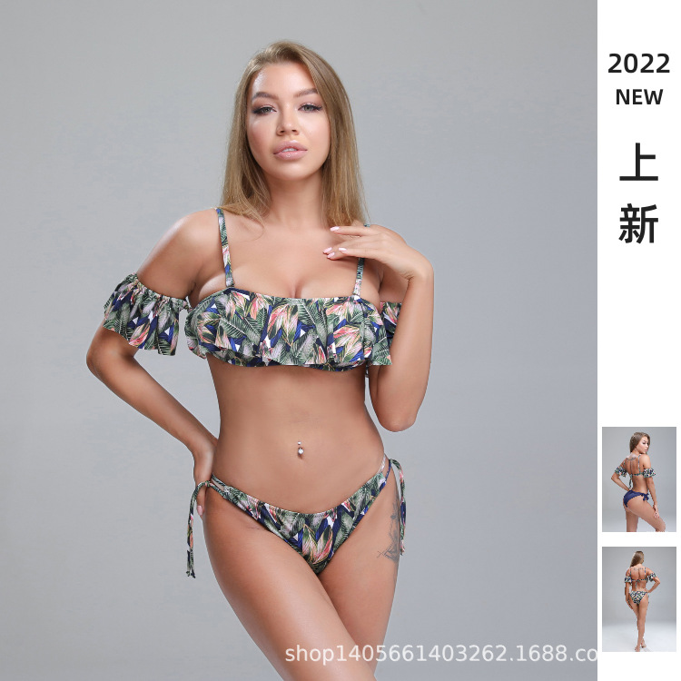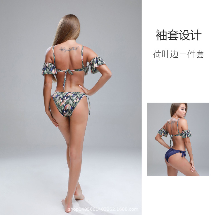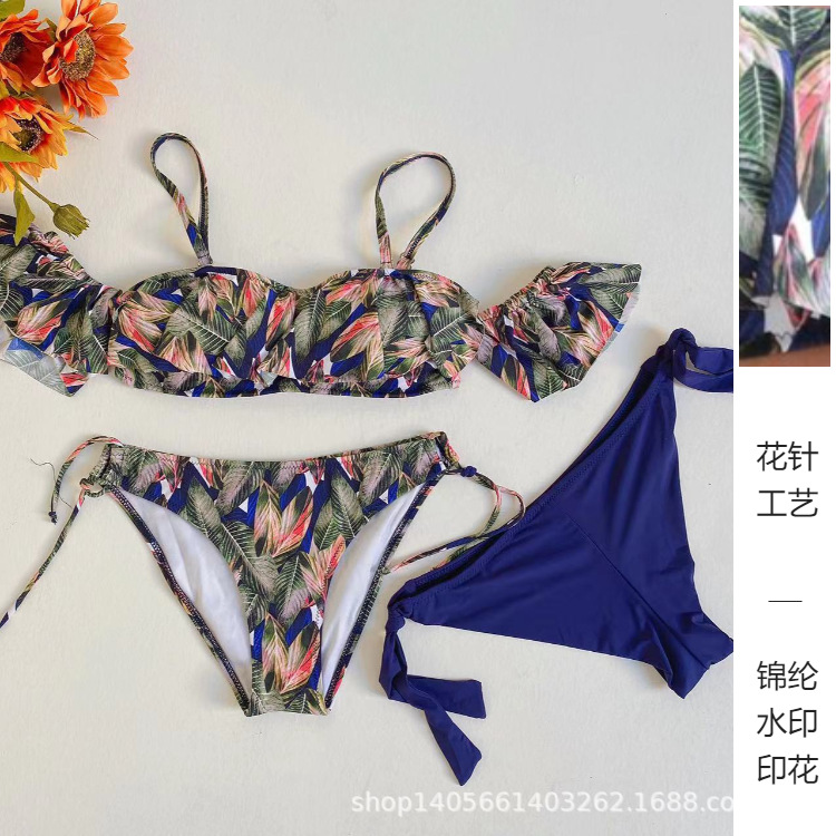 New three-piece bikini swimsuit ruffled leaf print South American one-line shoulder wrap vest for women