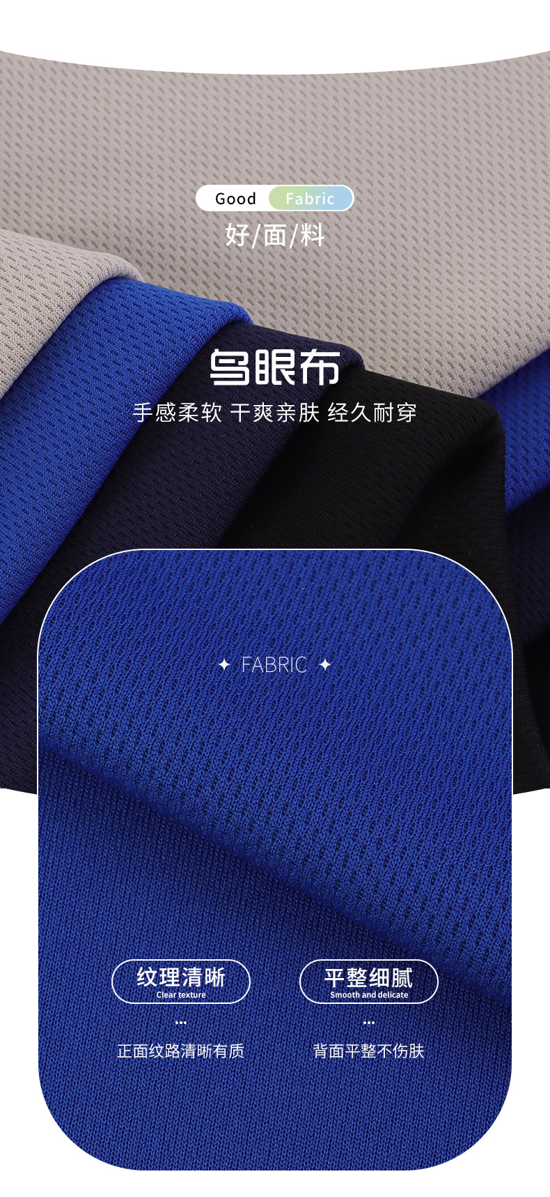 75D all-polyester grade 3 bird's eye fabric, mica mesh fabric, moisture-wicking and sweat-wicking inner lining, quick-drying sportswear fabric, T-shirt lining