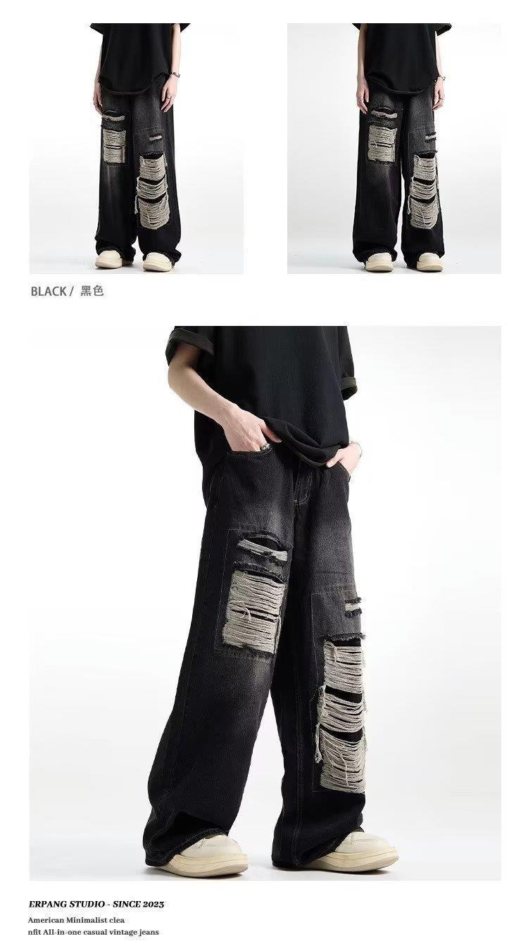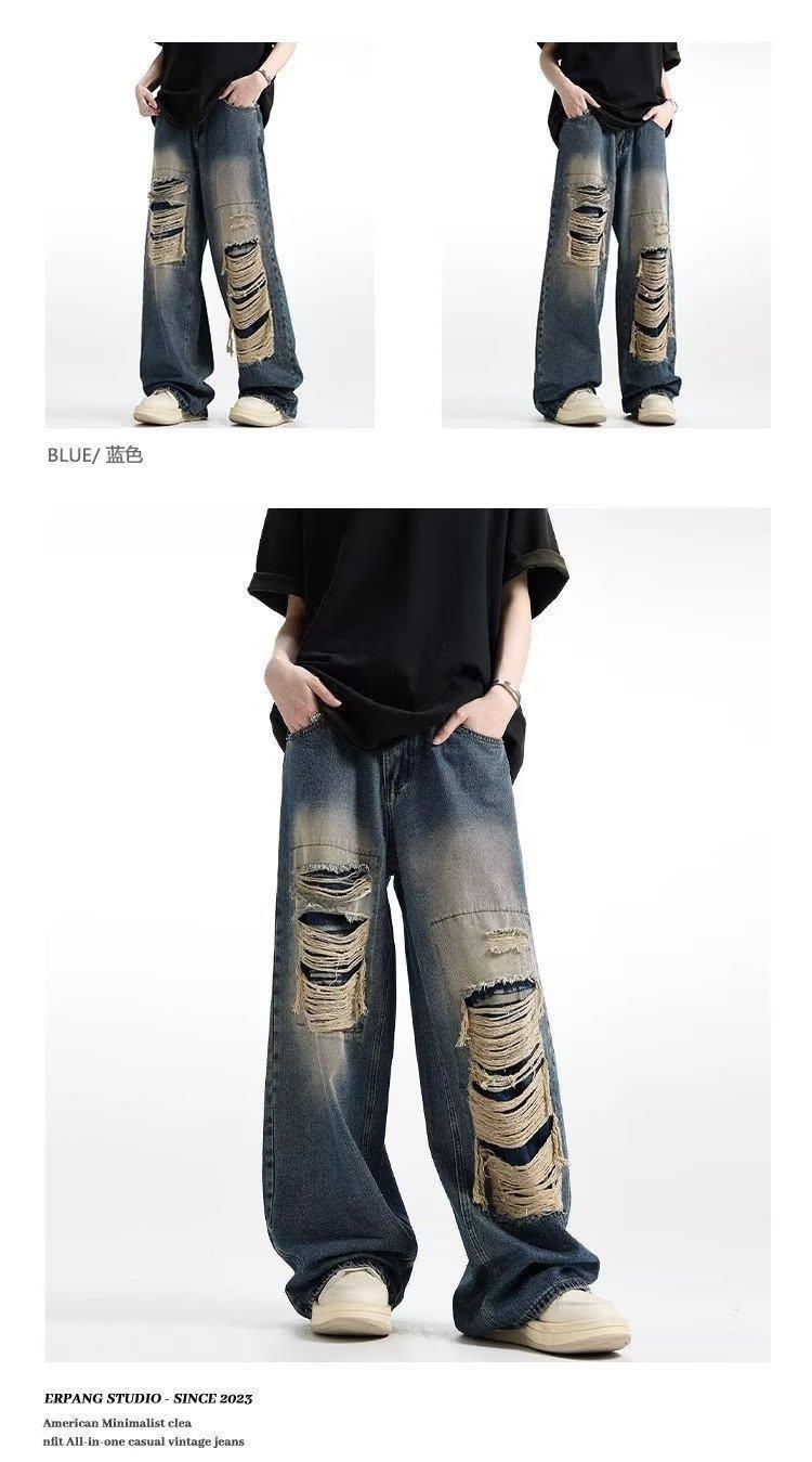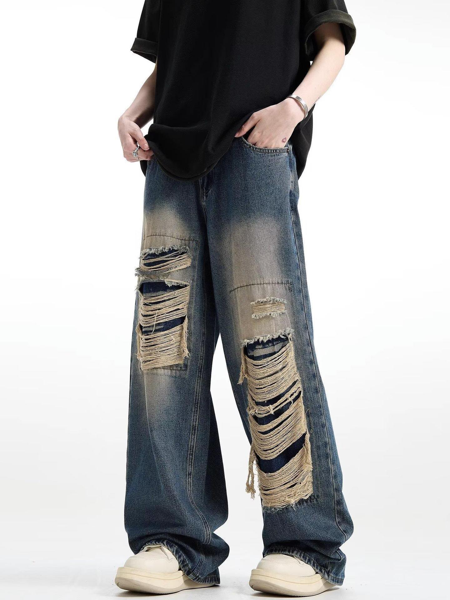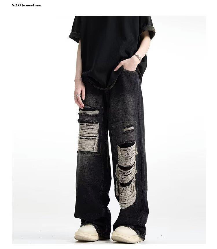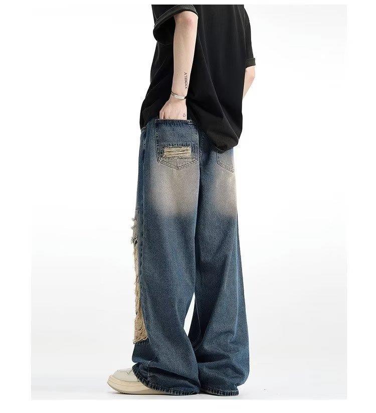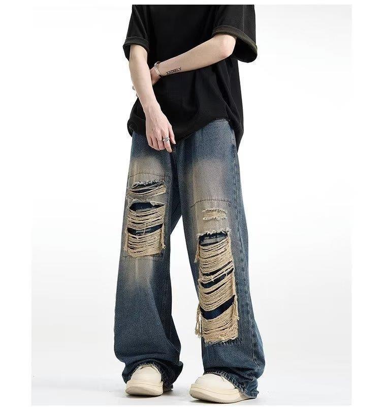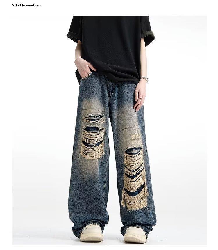 American vibe retro do old cloth ripped jeans women's high street design feel loose straight leg wide mop pants