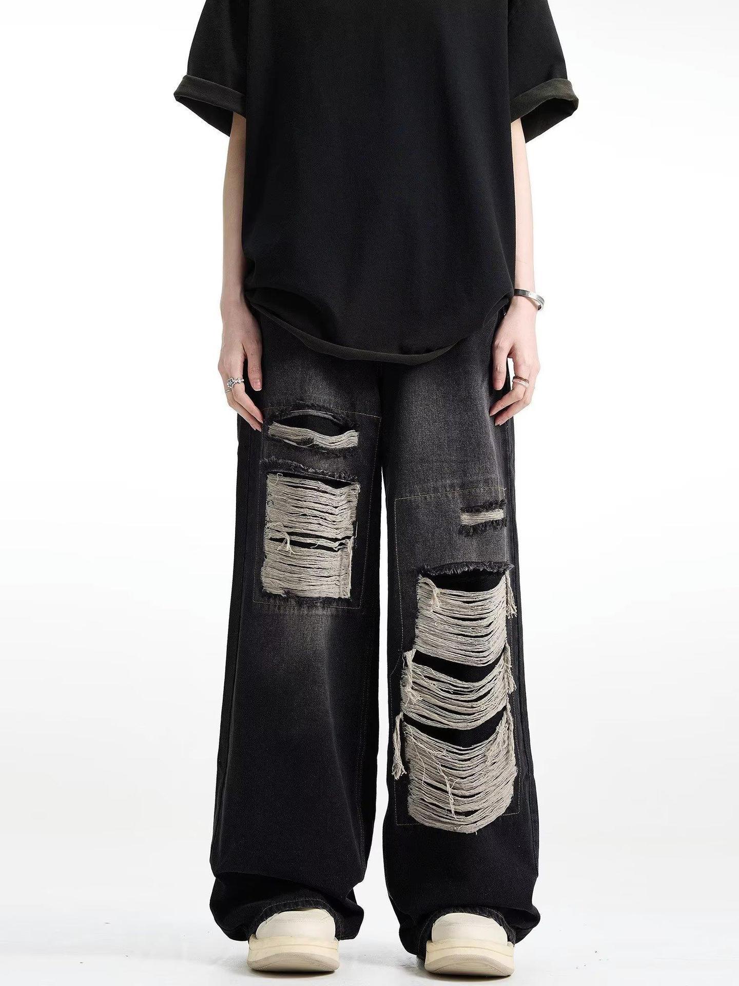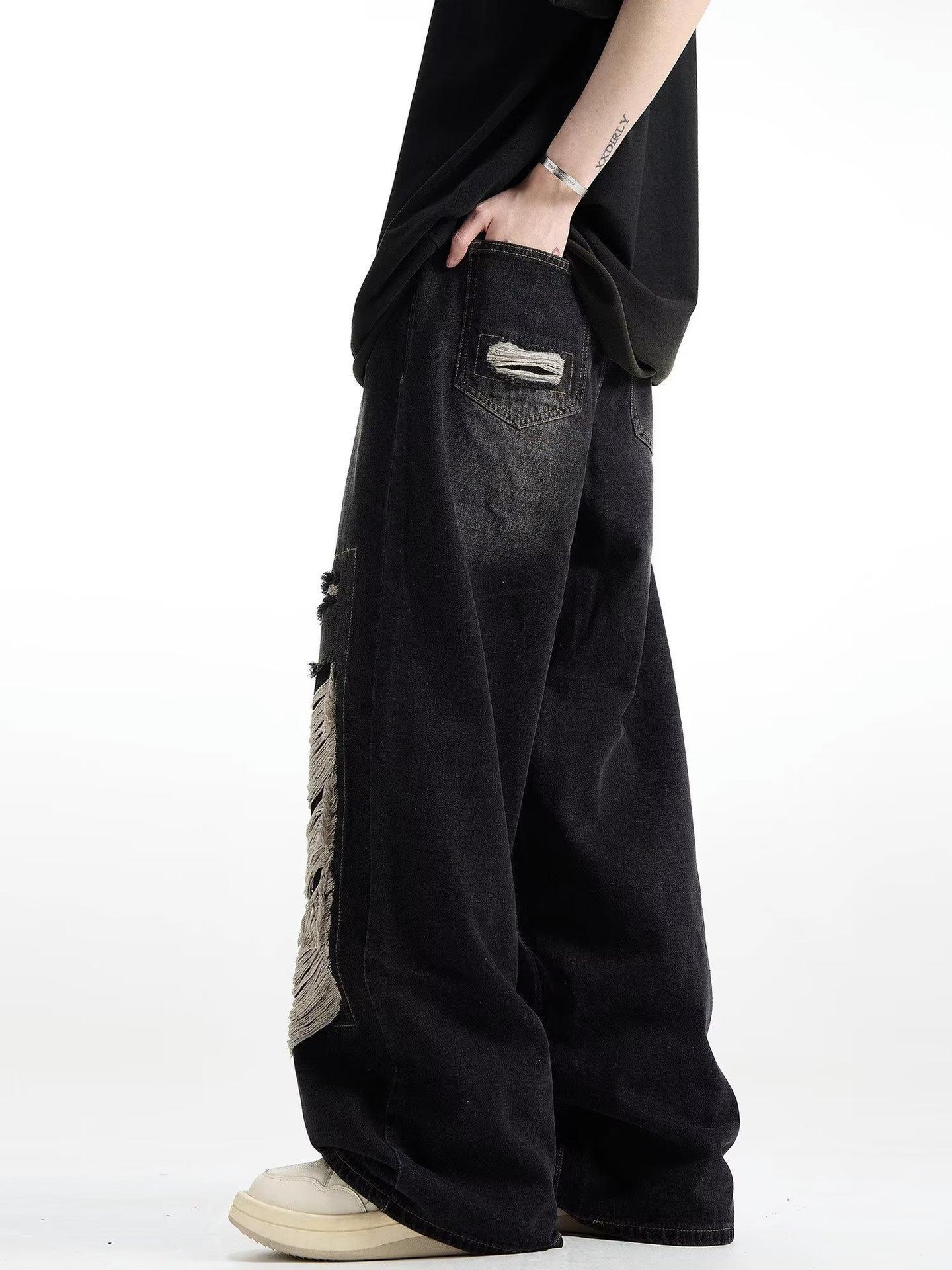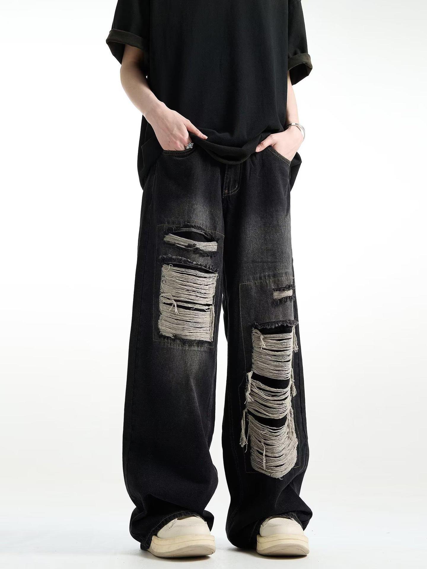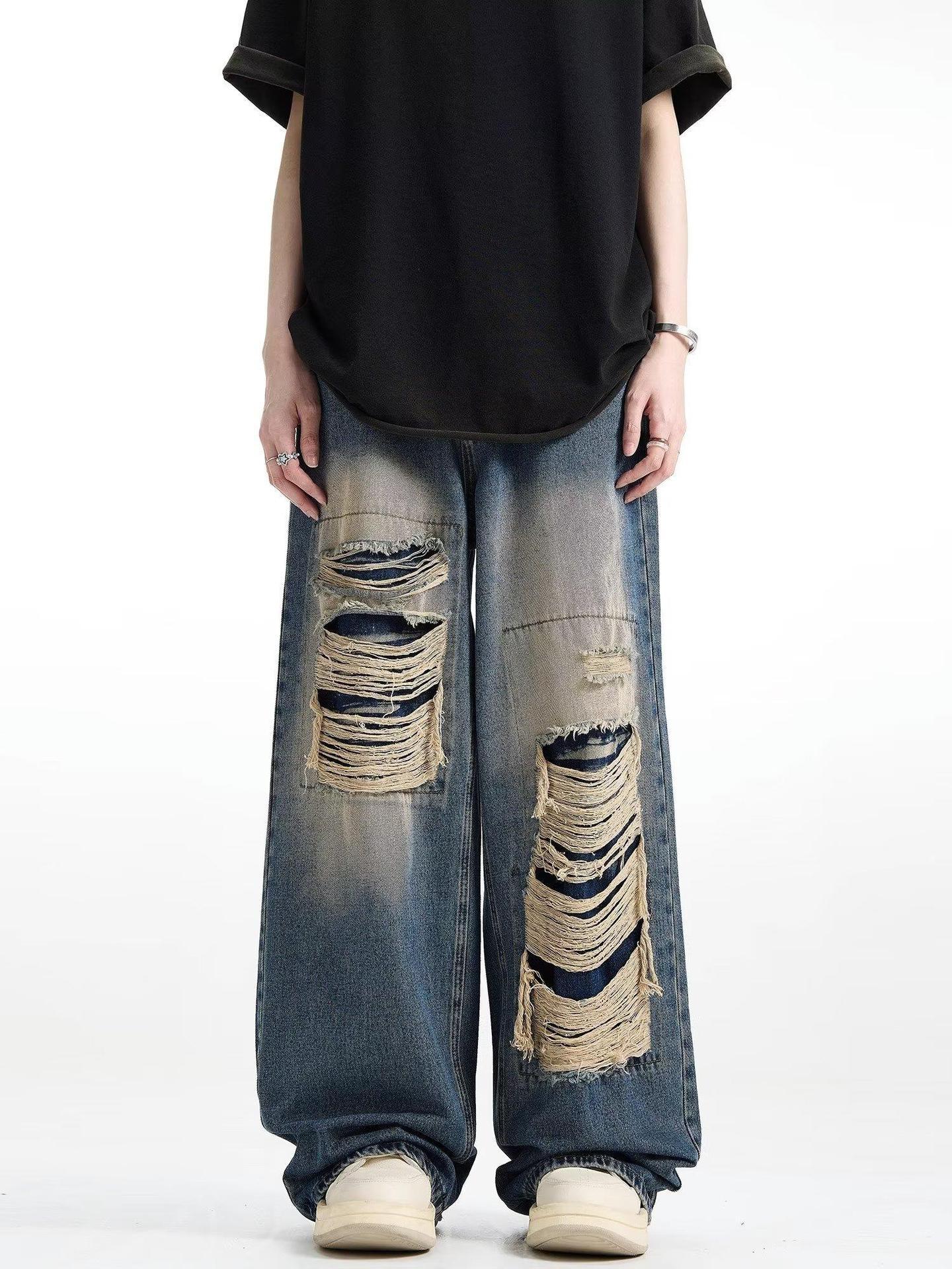American vibe retro do old cloth ripped jeans women's high street design feel loose straight leg wide mop pants