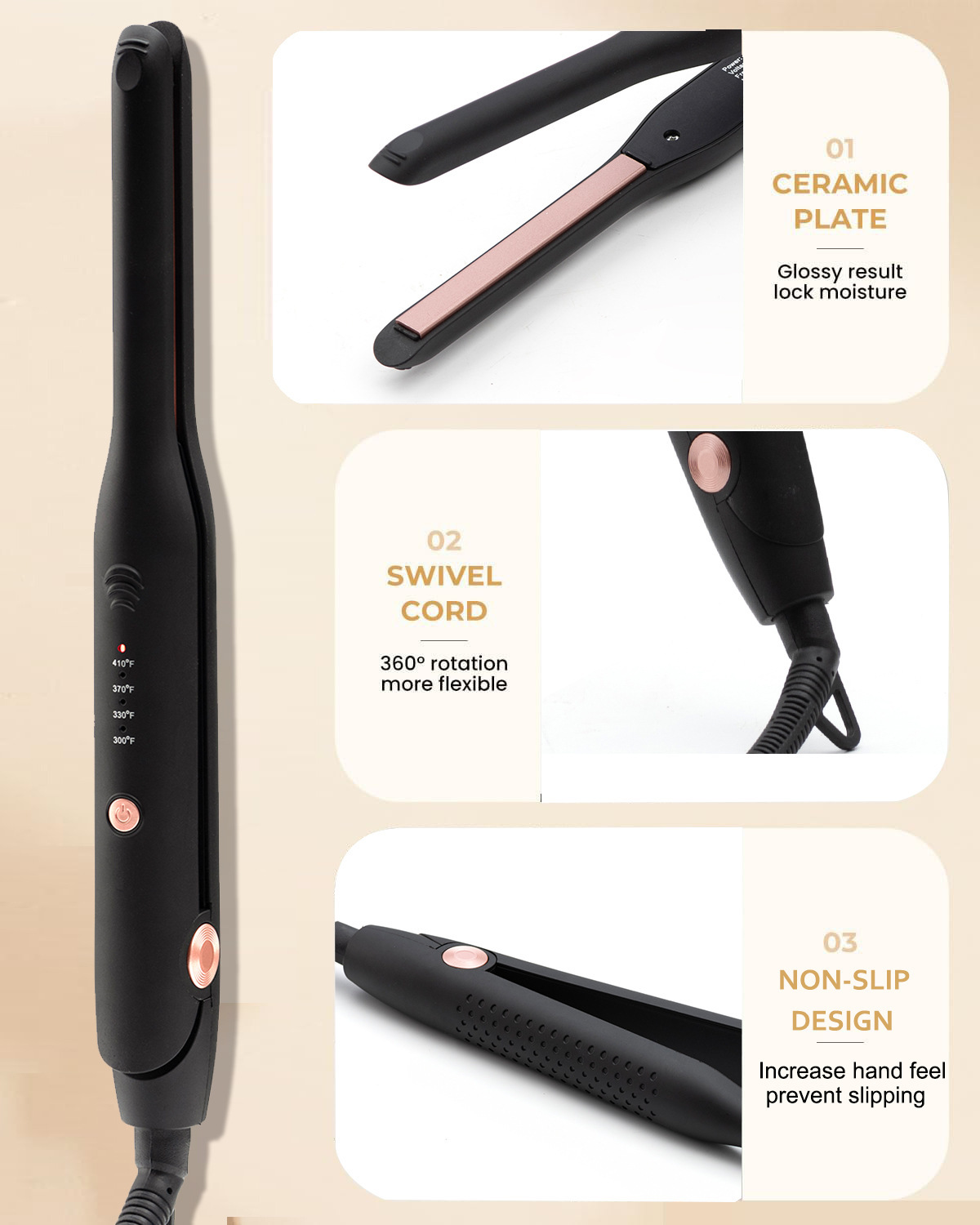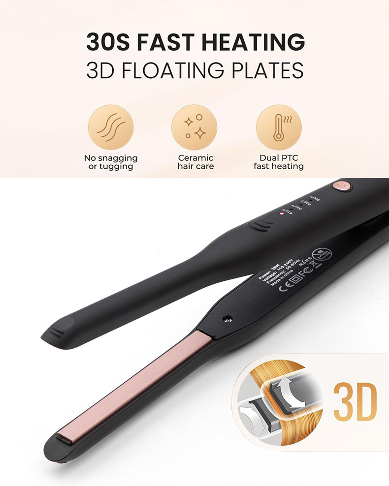 This is the new generationNarrow surface designThe straightener, which only heats up9mmThe width not only improves the problem that the regular hair straightener can not clip to the top of the head, but also is an essential tool for men and women with short hair. Its rounded shape is designed to make curly hair easy to use, whether it's wavy or curly. The product also has a number of design highlights, its front end contains the characteristics of double heat insulation, the back adds a number of concave and convex anti-slip points, the surface is sprayed with multi-layer glaze process, but also intimate with 4 temperature control.