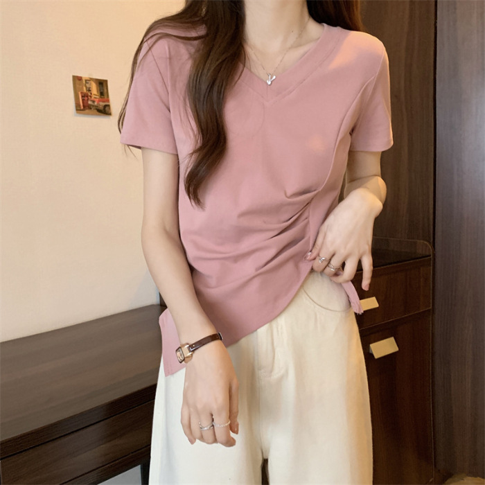 A 2024 pink V-neck short-sleeved T-shirt for women with a summer design sense, featuring a unique pleated, cinched waist and slit irregular top
