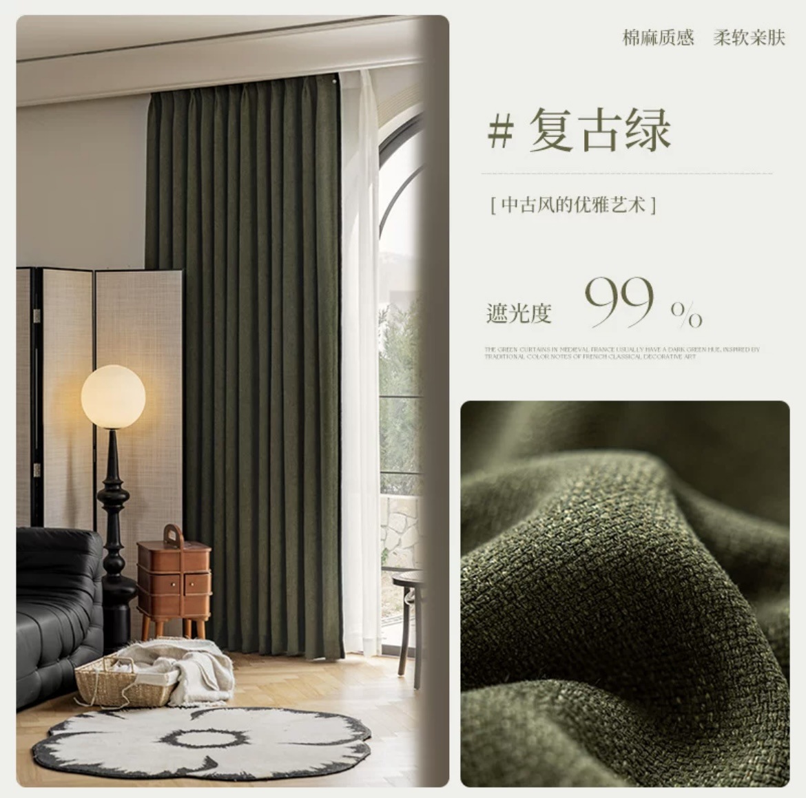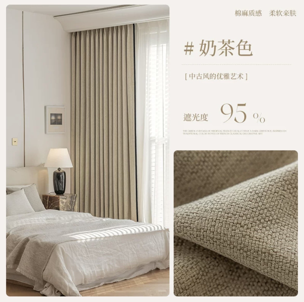 A bedroom with a vintage vintage nylon cotton and linen curtain fabric, thickened blackout fabric, French retro black border, and a light luxury and high-end feel