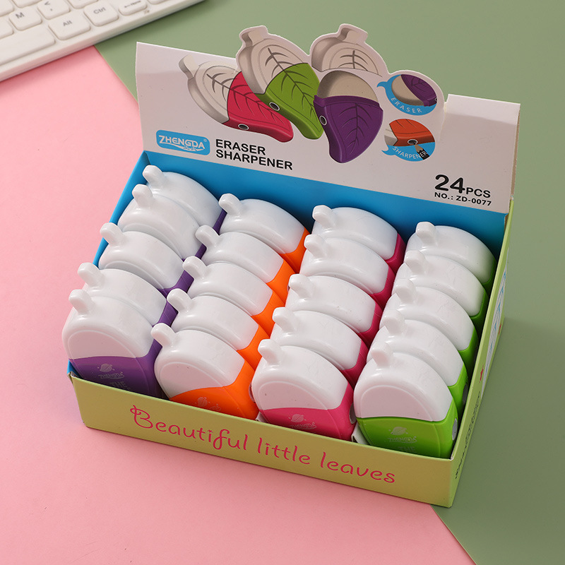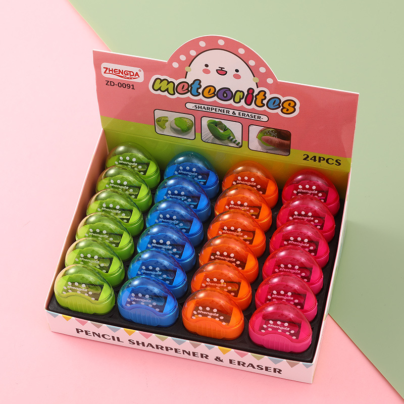 A creative student stationery product that combines a pencil sharpener and an eraser. It features a cute and colorful design with a double-ended clean and less flaky eraser