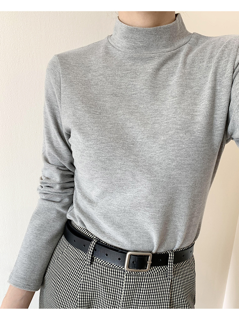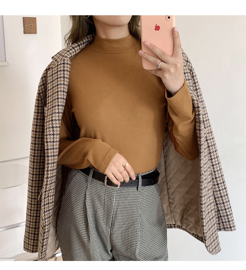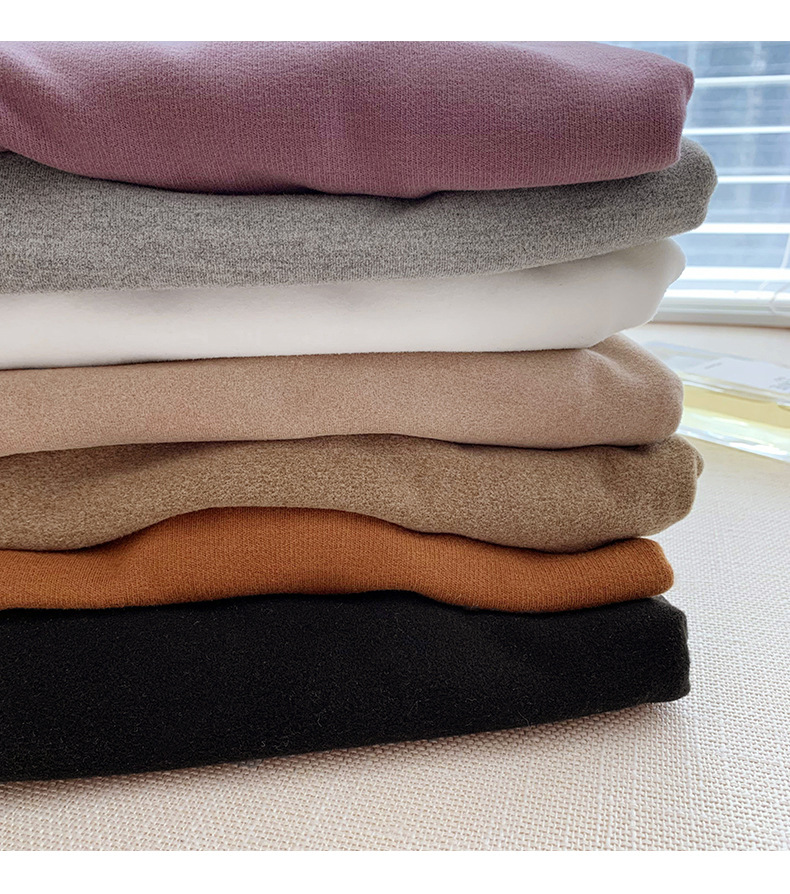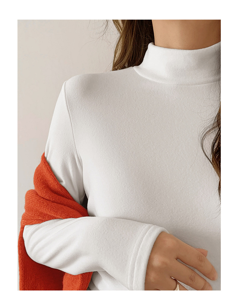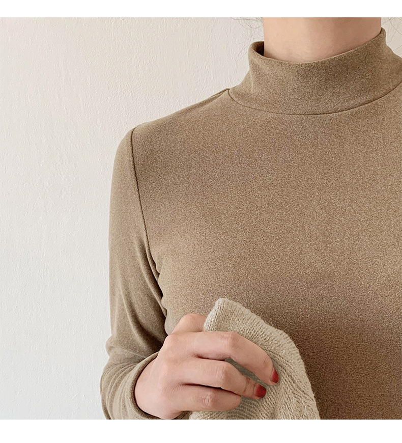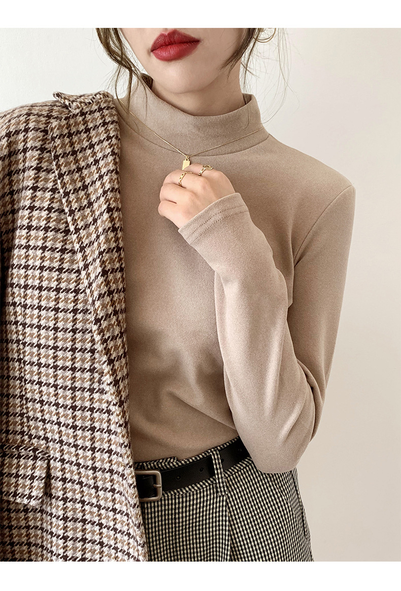 A double-sided German fleece semi-high neck base layer for women's autumn and winter in solid color, paired with a fleece, thickened, brushed, and fitted long-sleeved top