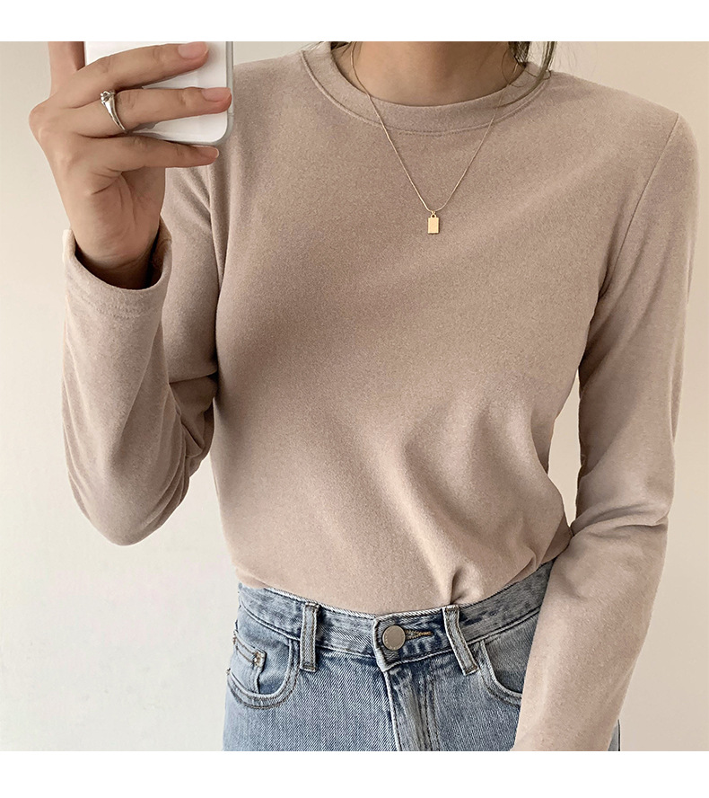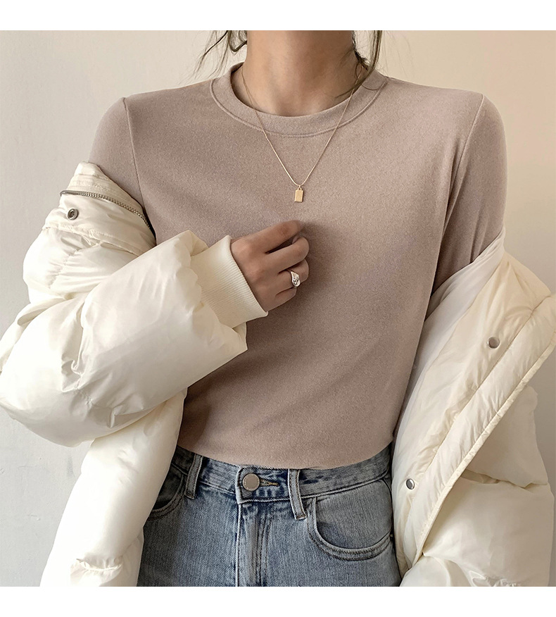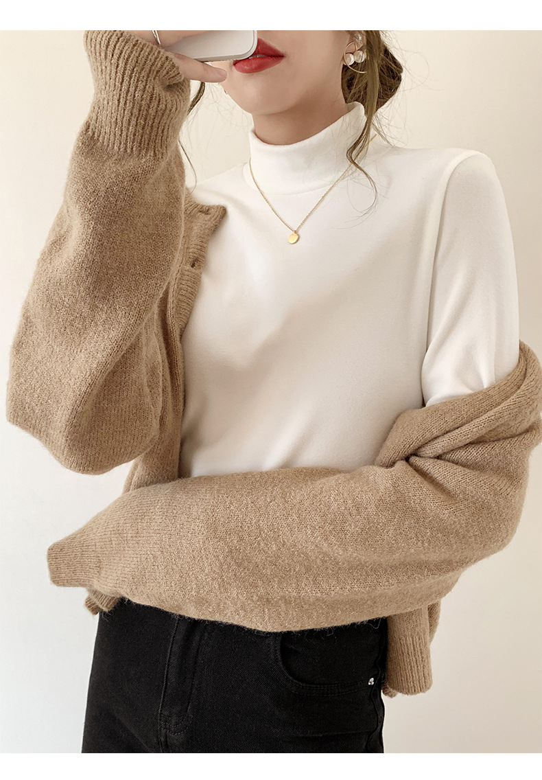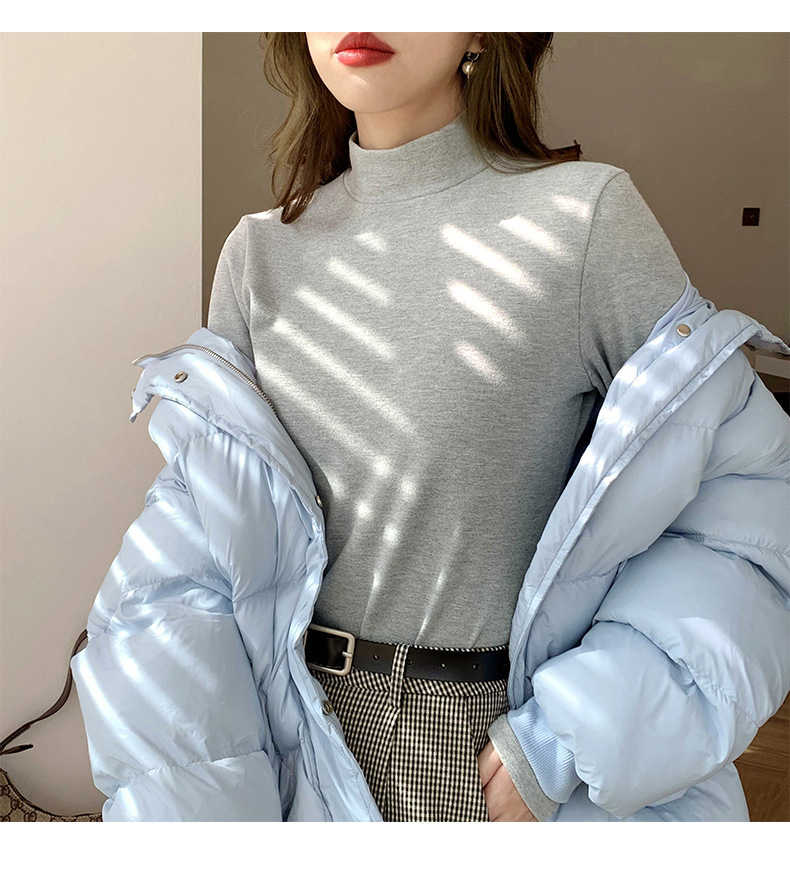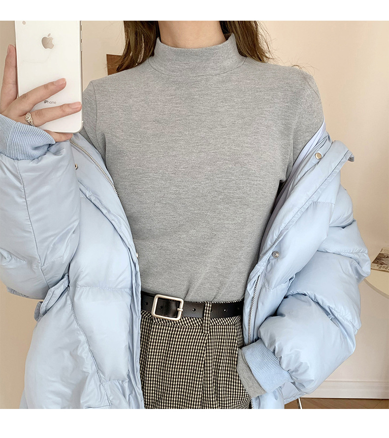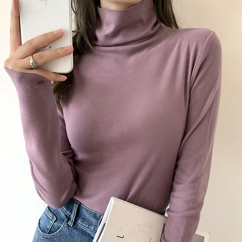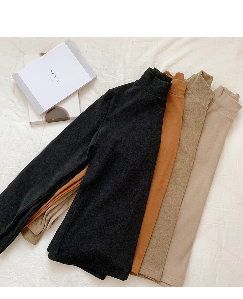 A double-sided German fleece semi-high neck base layer for women's autumn and winter in solid color, paired with a fleece, thickened, brushed, and fitted long-sleeved top