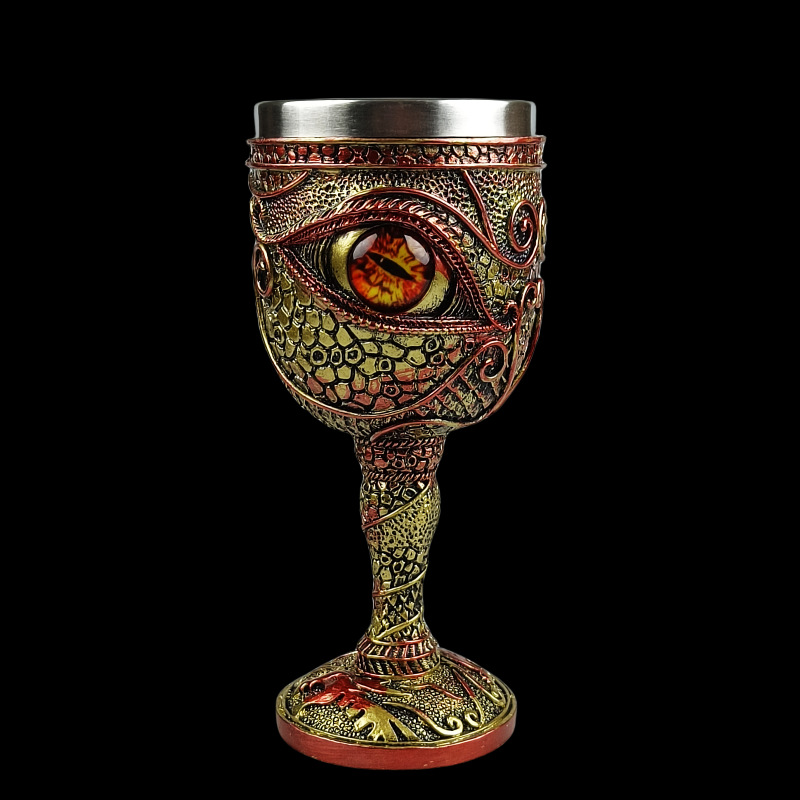 A dragon eye wine glass with a unique European medieval mythological dragon statue, a dragon eye red wine glass, and the devil's eye