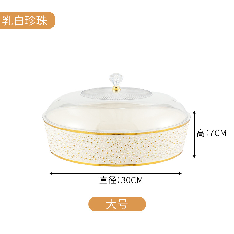 A golden-edge transparent storage box with a lid, a pearl-textured round fruit plate, a desktop for organizing and storing food and snacks
