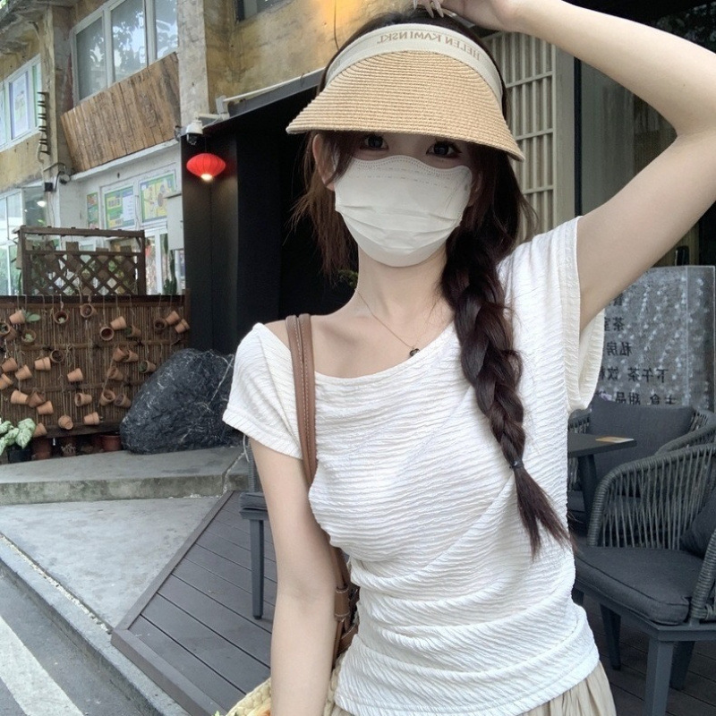 A Korean-style short-sleeved T-shirt with a slanted shoulder texture for women, suitable for summer slimming and shaping. Pair it with a white base layer for a stylish look
