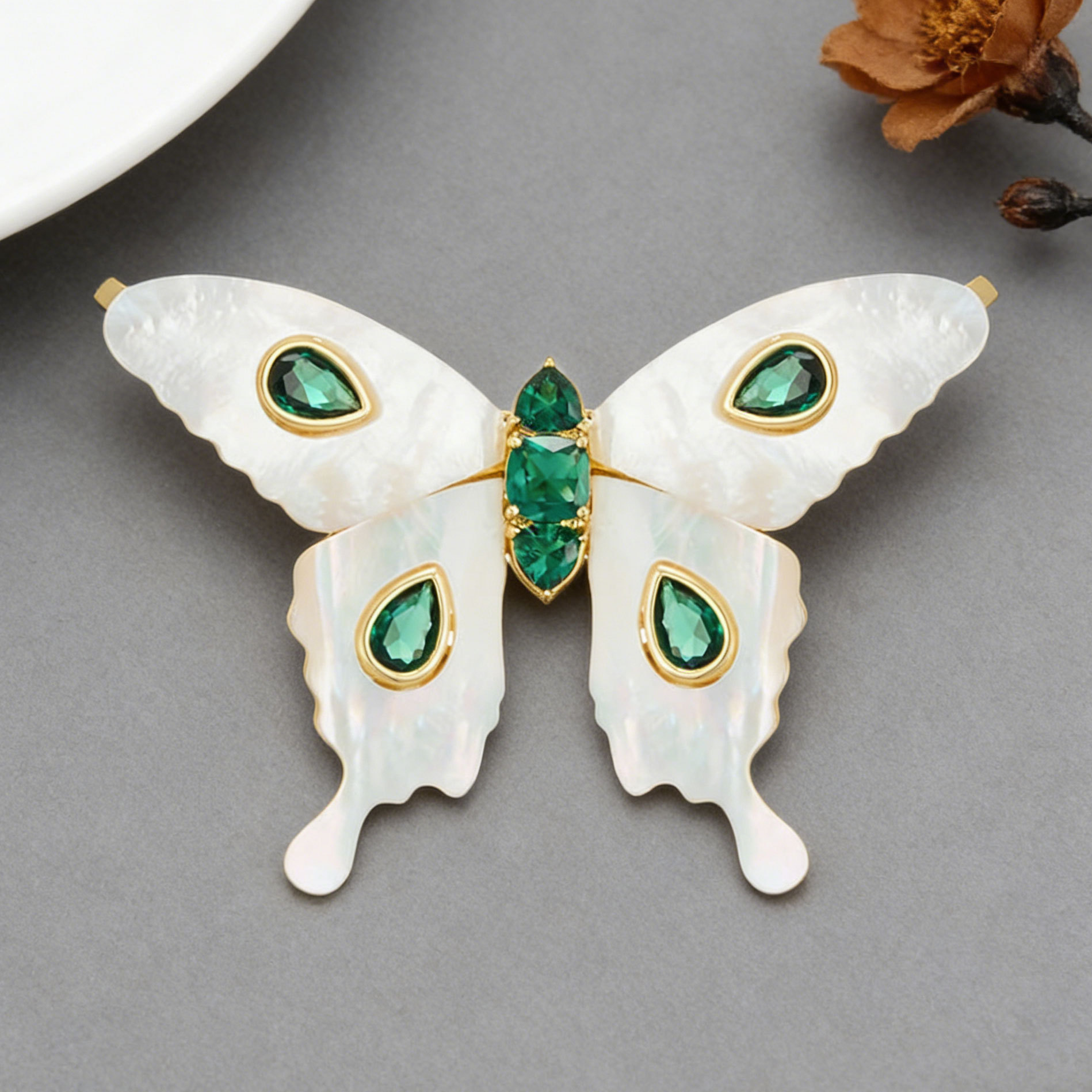 A light luxury and high-end natural mother-of-pearl butterfly brooch, an original design of copper alloy with zirconium emerald blue spinel