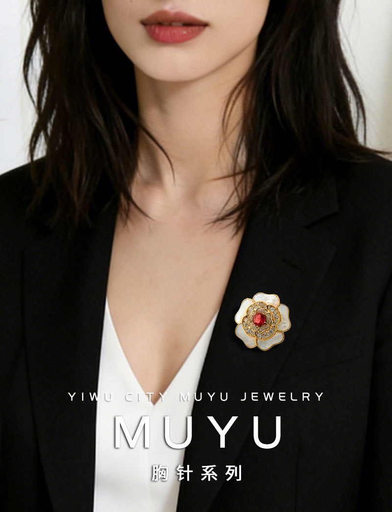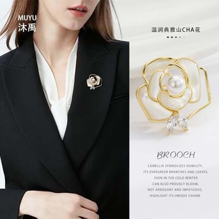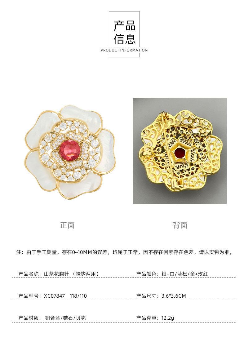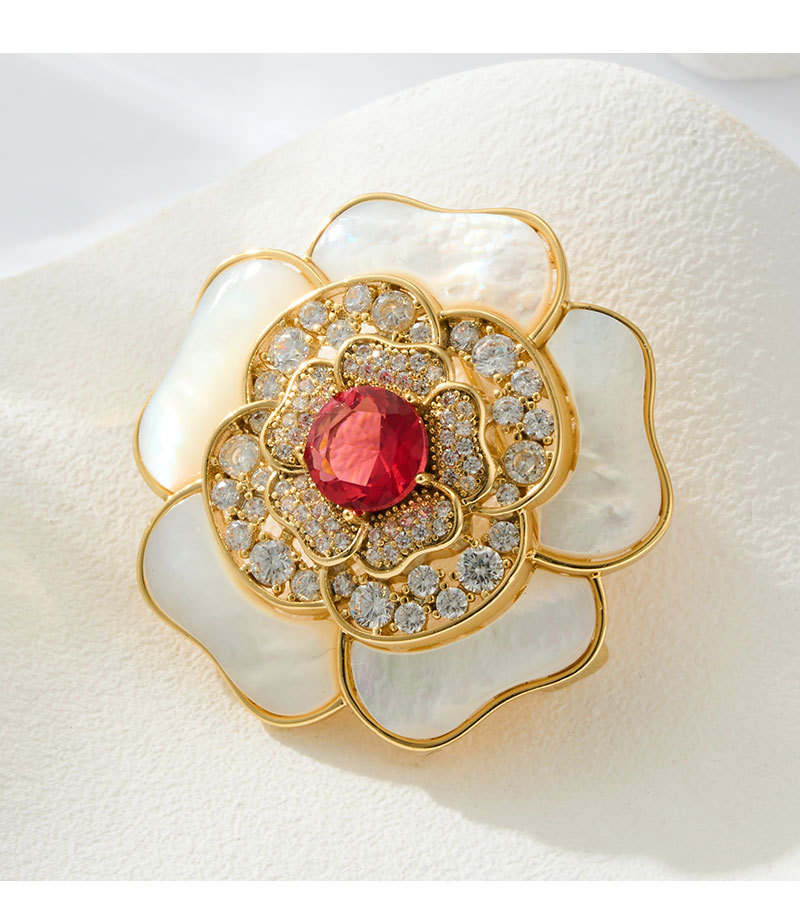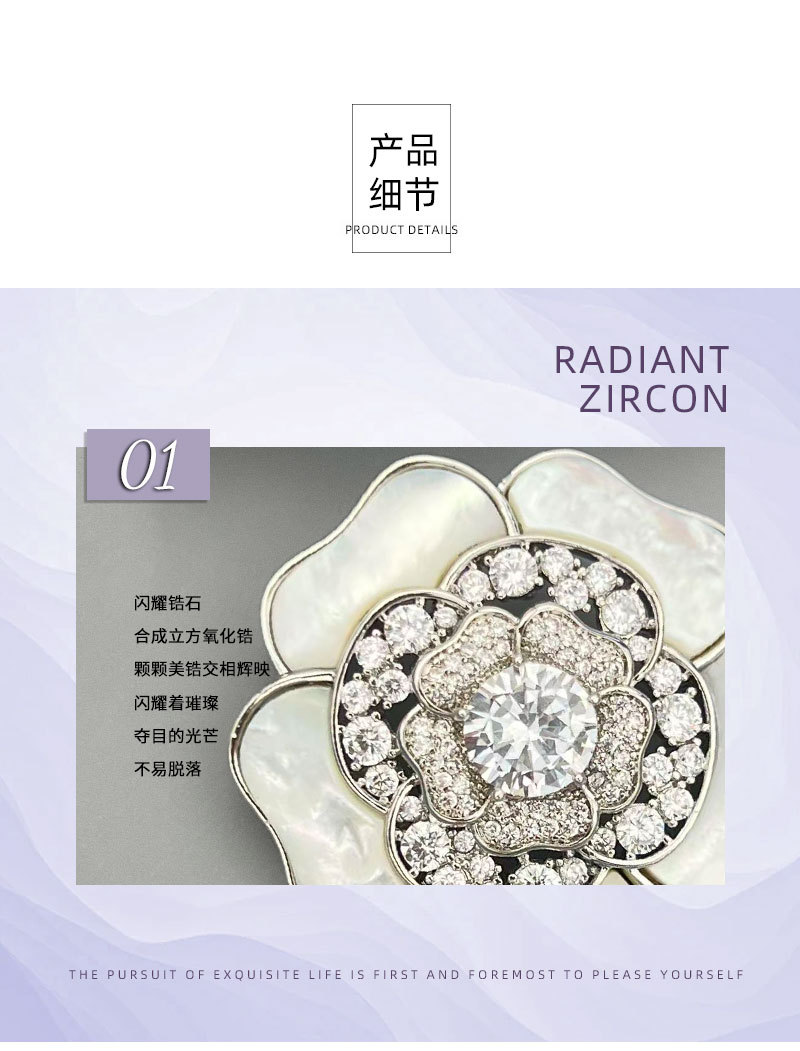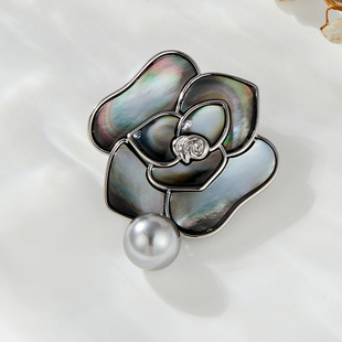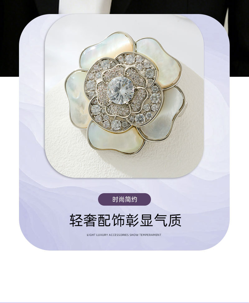 A light luxury and high-end natural mother-of-pearl camellia brooch, copper alloy slightly inlaid zircon, fashionable and versatile women's accessory pin