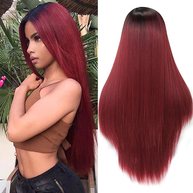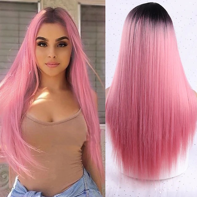 A mid-parted long straight hair wig with a gradient of multiple colors and a fashionable long bangs made of synthetic fiber