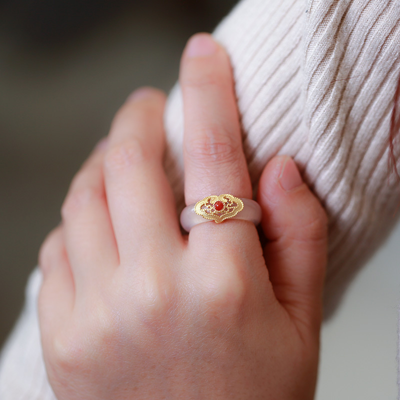 A natural white agate ring with chalcedony and S925 silver inlaid with Nan Hong agate in a ruyi style women's ring jewelry, featuring a traditional Chinese style