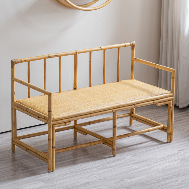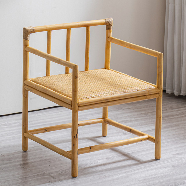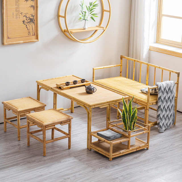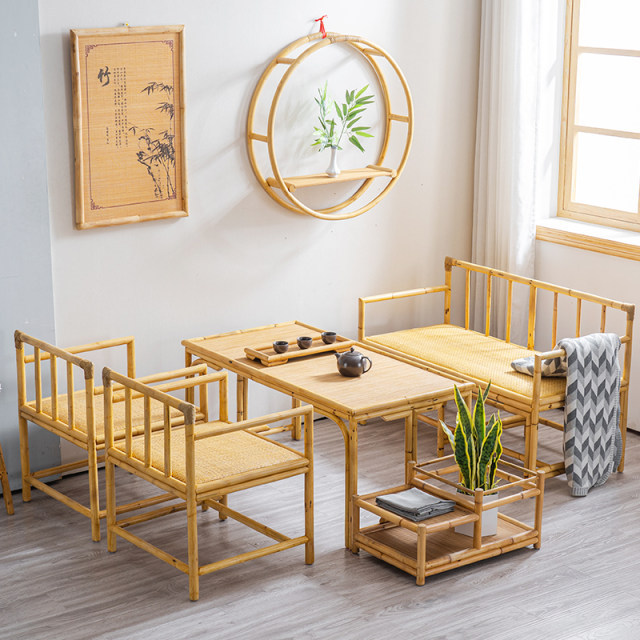 A new Chinese-style Zen tea house and homestay with a combination of bamboo and rattan double sofas and tables and chairs, featuring a simple and modern interior