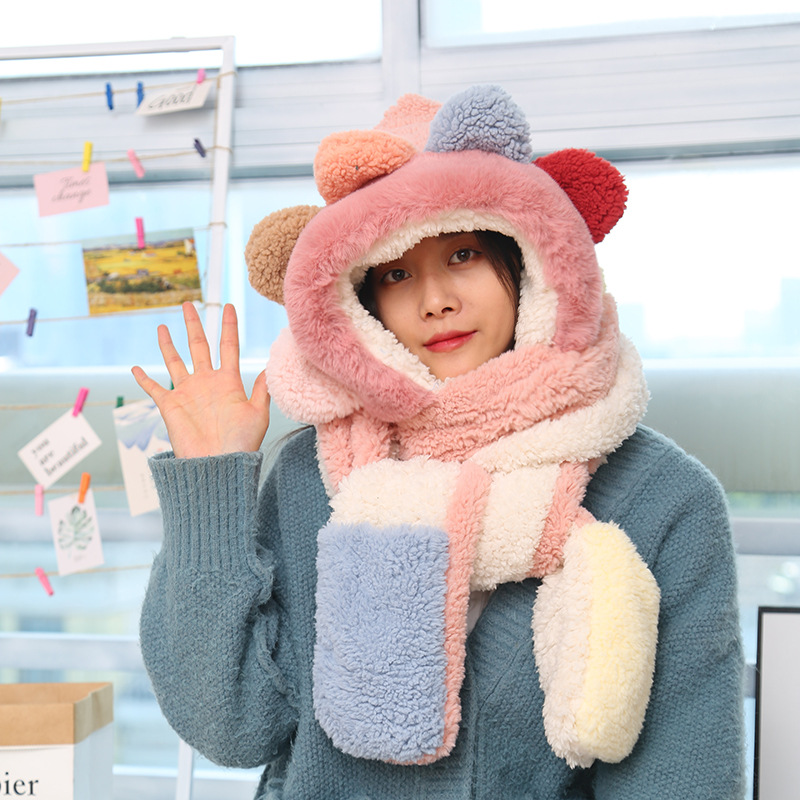 A new cross-border autumn and winter plush warm neck set for women, featuring a cute little dinosaur hat, scarf and gloves in one set