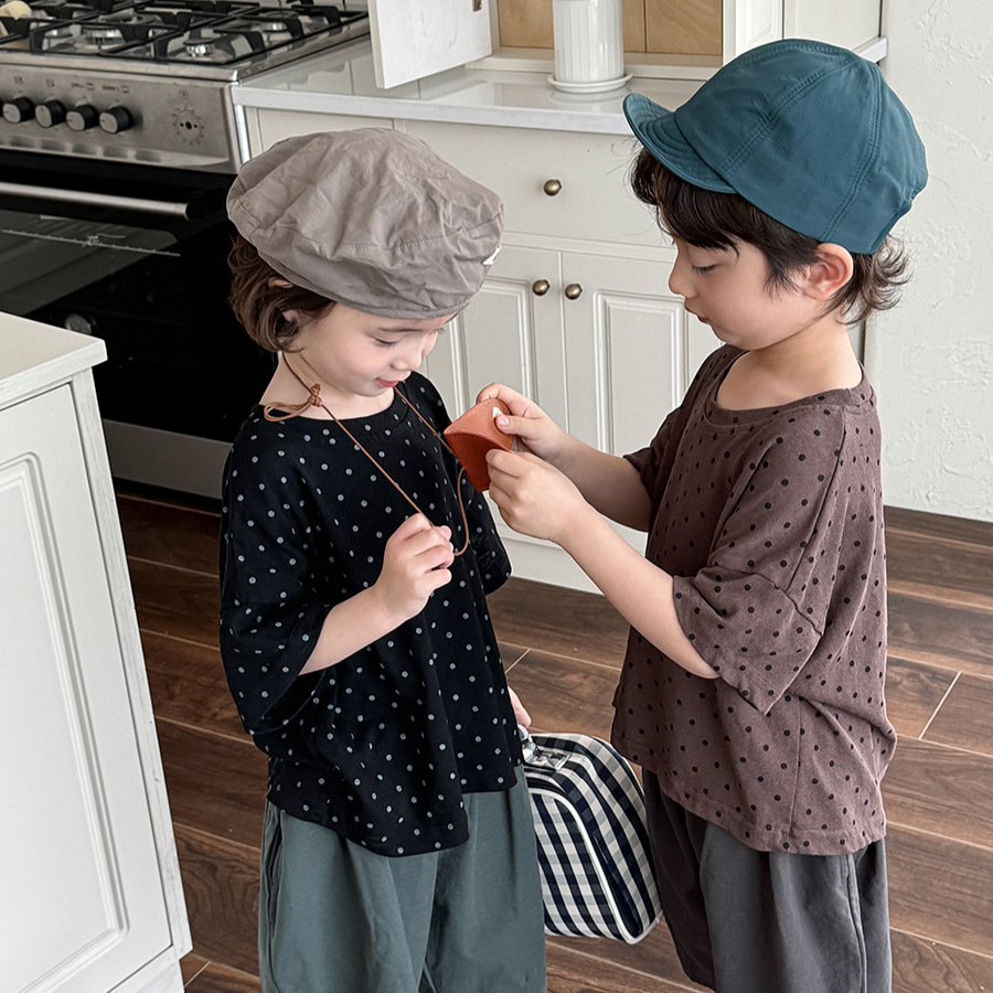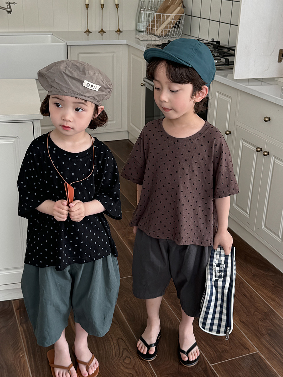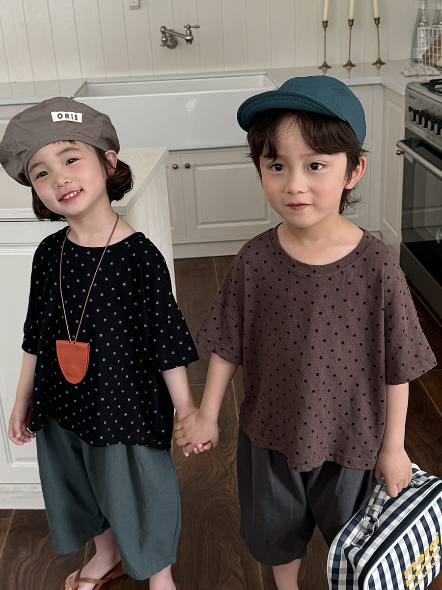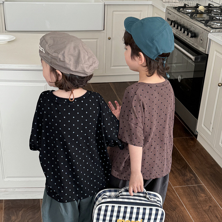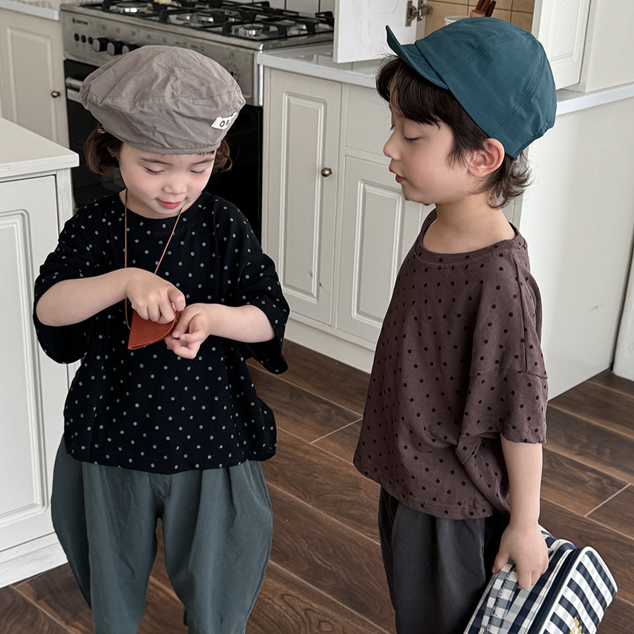 A new polka dot short-sleeved T-shirt for children's summer 2025, featuring a simple forest-themed half-sleeved top for kids